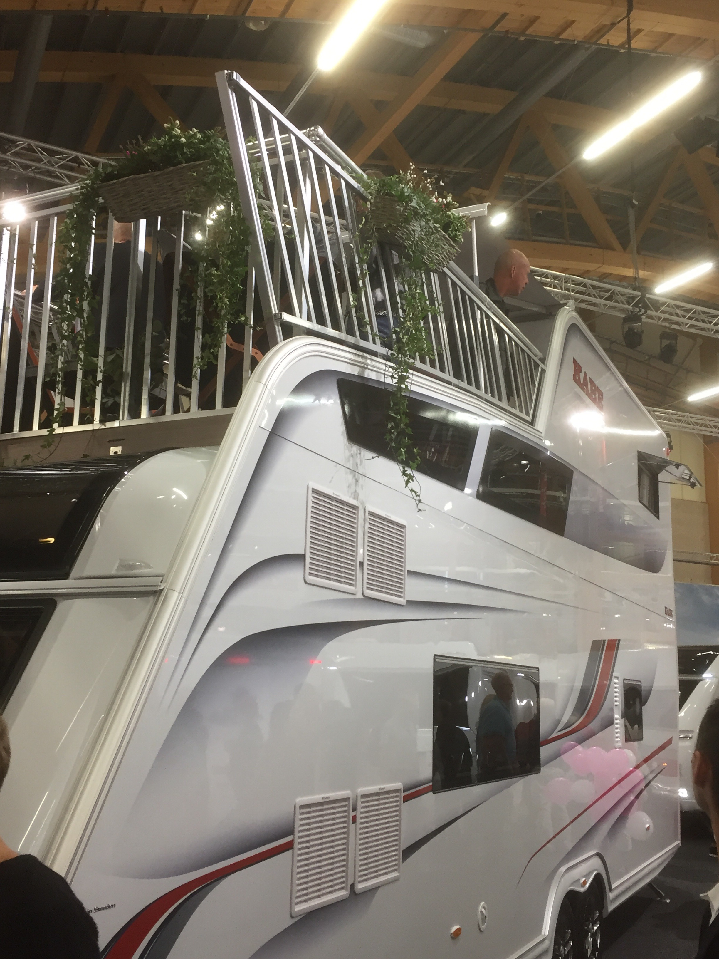 En husvagn med terass på taket.