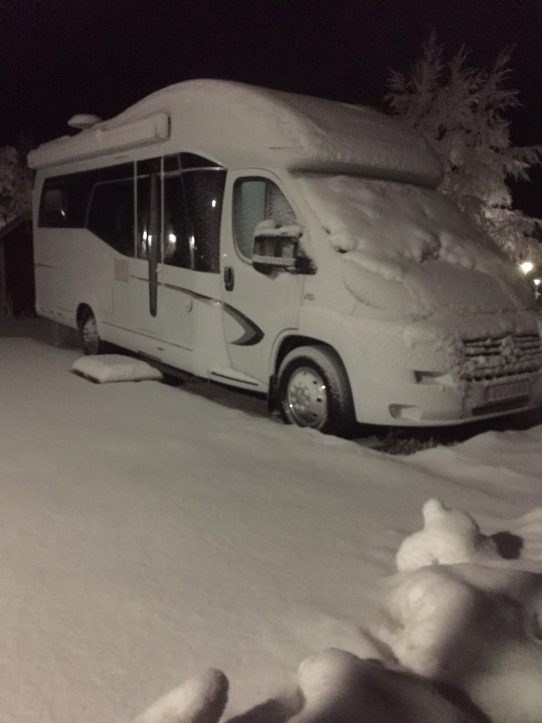 När vi kommer fram till husbilen fick vi börja med att skotta oss fram.