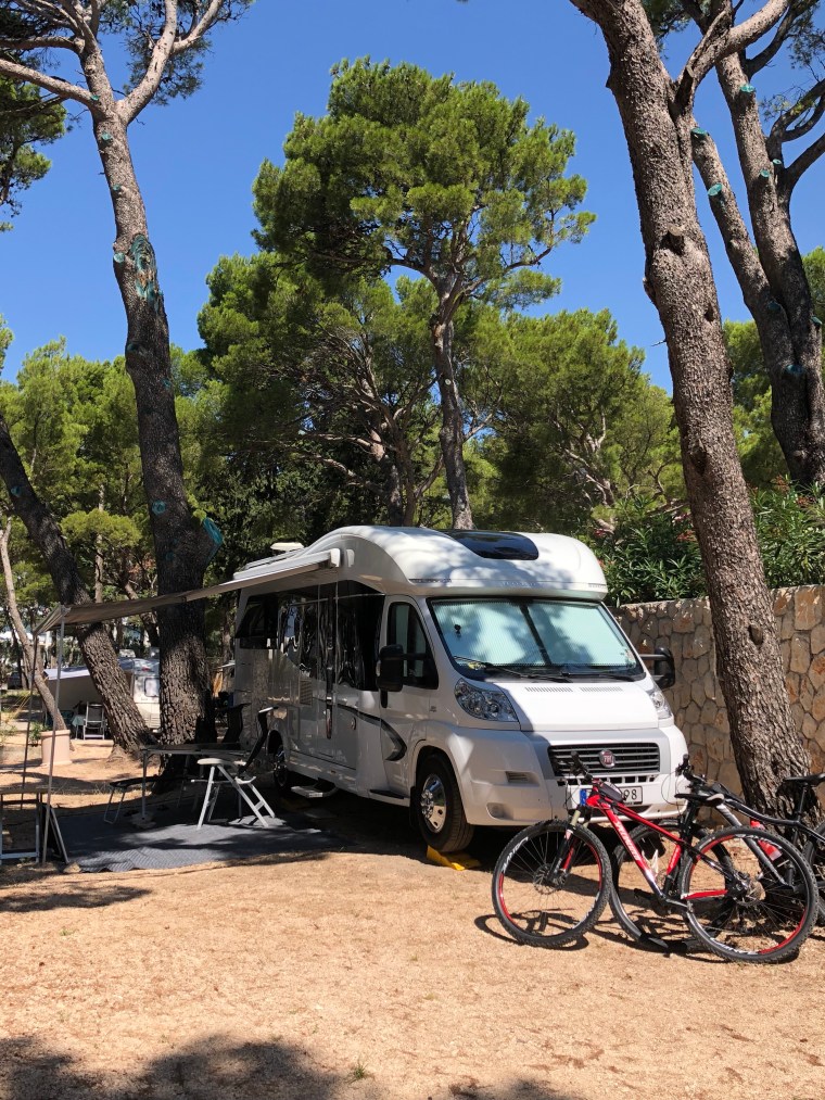 Vi kommer fram till Makarska och Camp Riviera och lyckats hitta en plats som vi tycker passar oss. Vi fick visserligen fickparkera och köra upp på klossarna, även om det inte riktigt räckte så fungerade det. Jag var lite rädd att gubben skulle ramla ut genom fönstret på natten och hamna under grannens husvagn, men det gick bra.