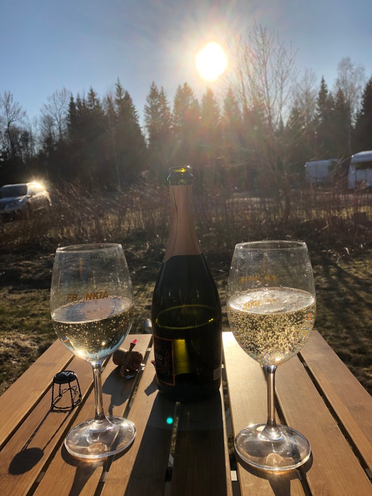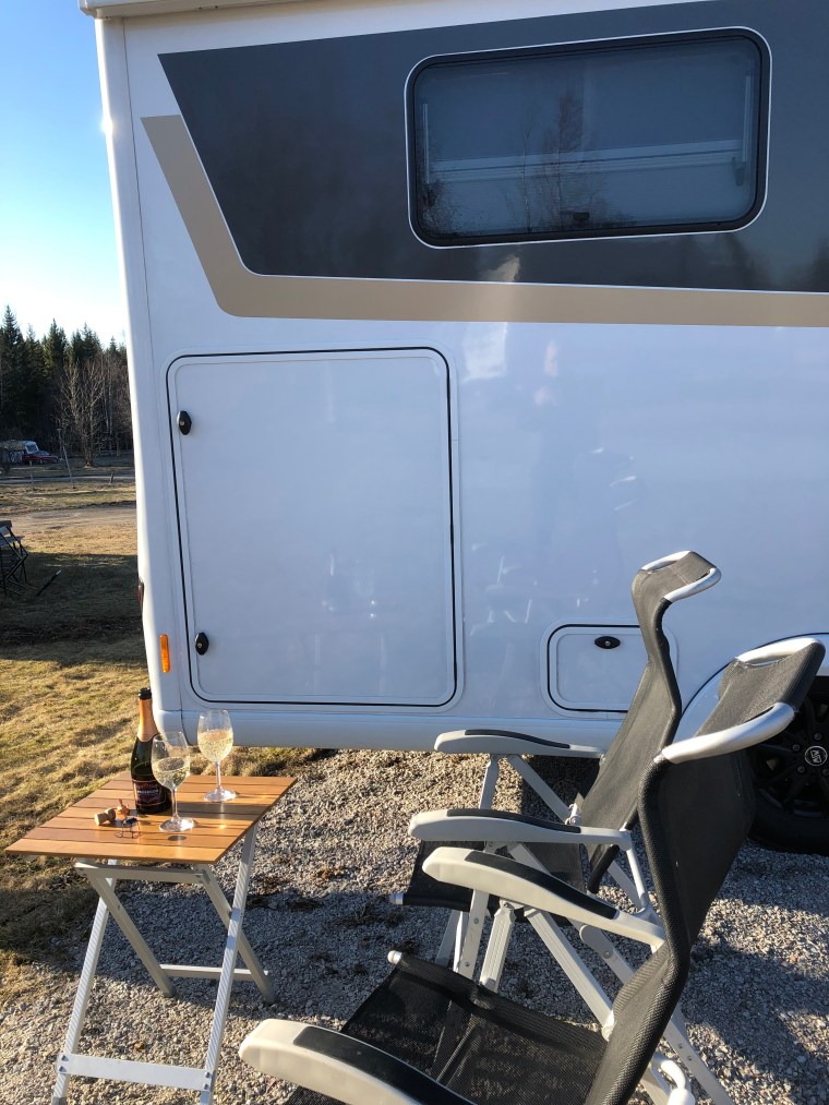 Kom fram till Ånnaboda Camping vid 17-tiden och såg grannarna satt ute med ett glas vin. Vi ville ju inte vara sämre, så vi parkerade och tog fram trädgårdsmöblerna.