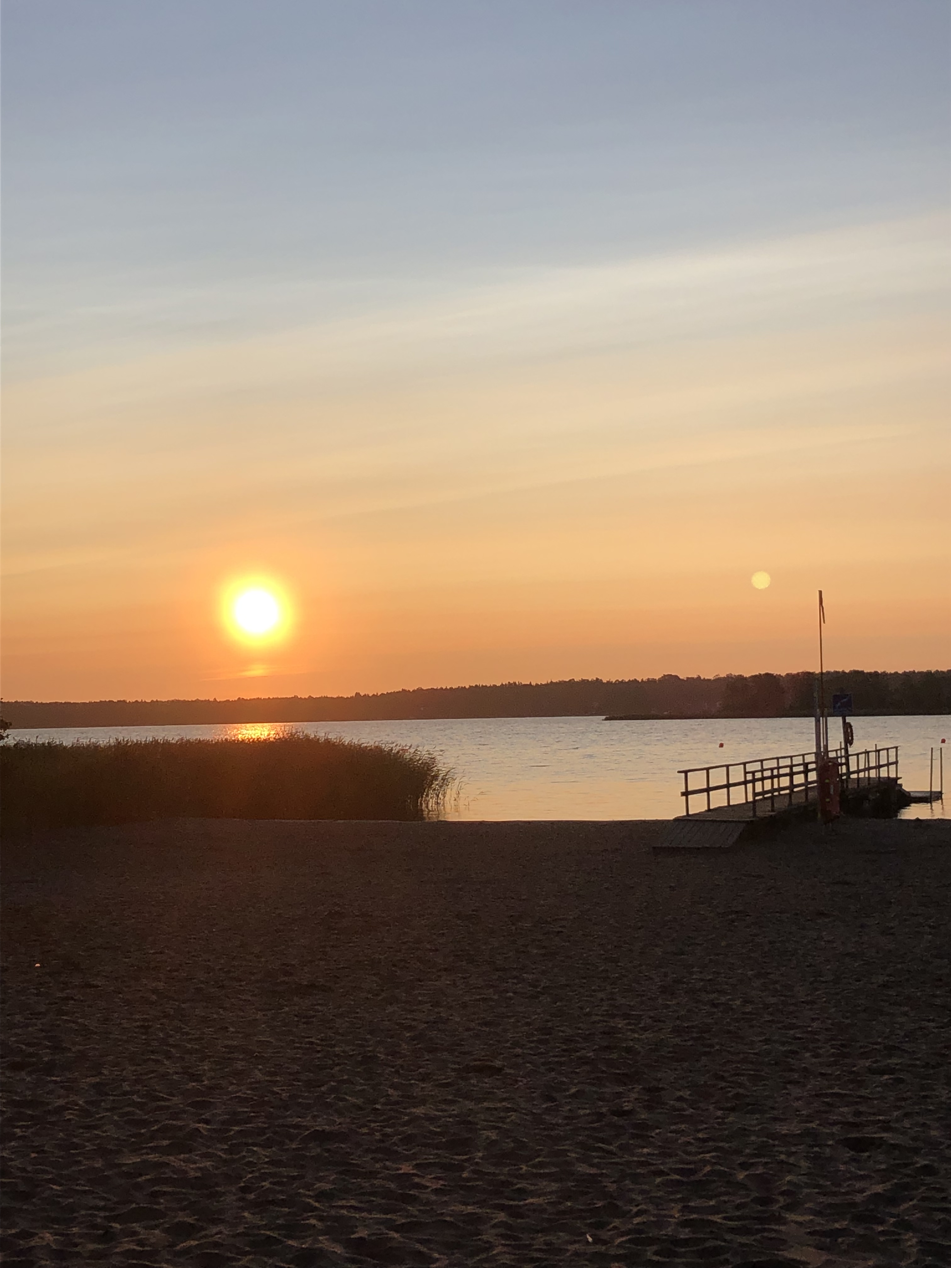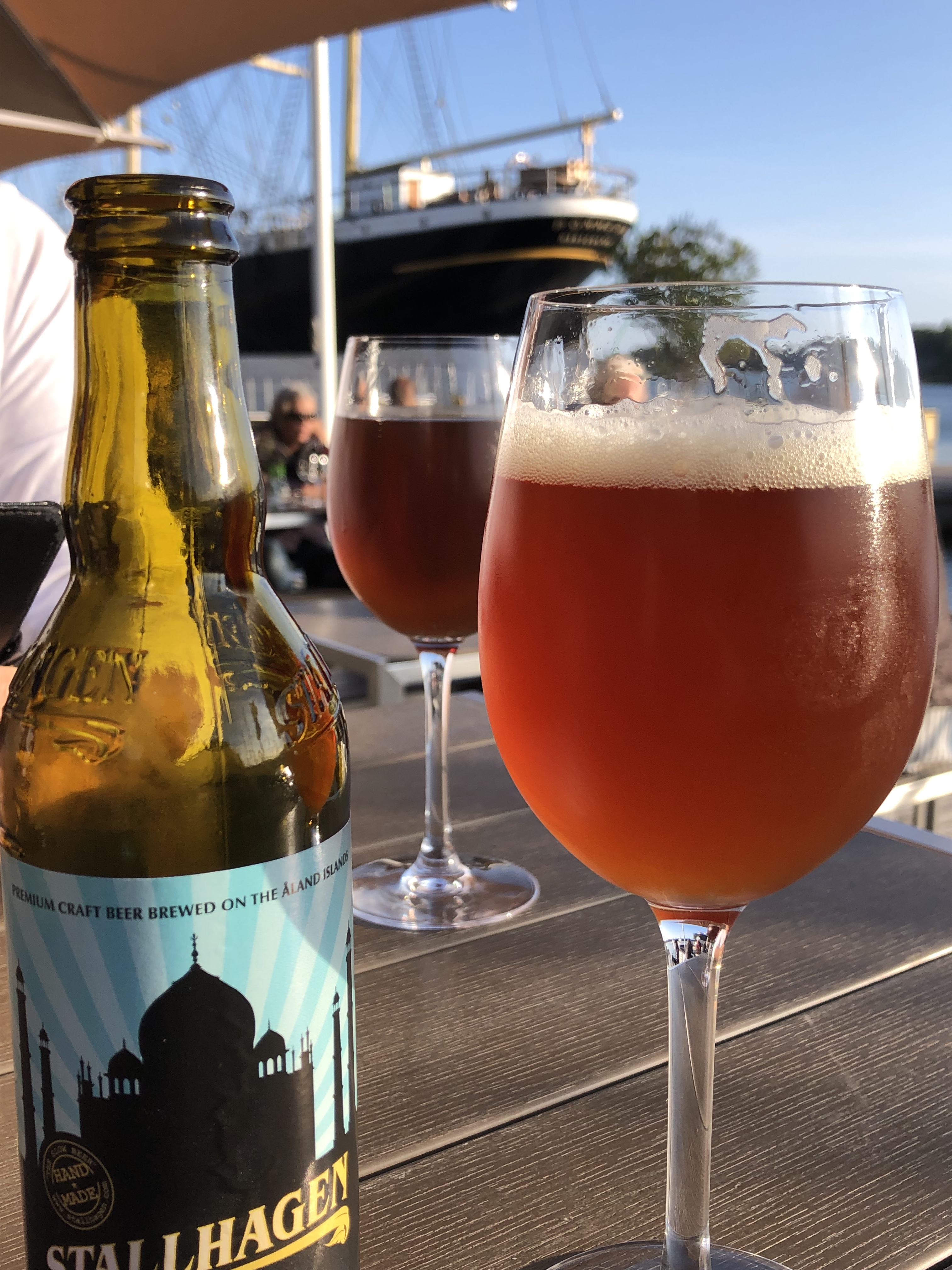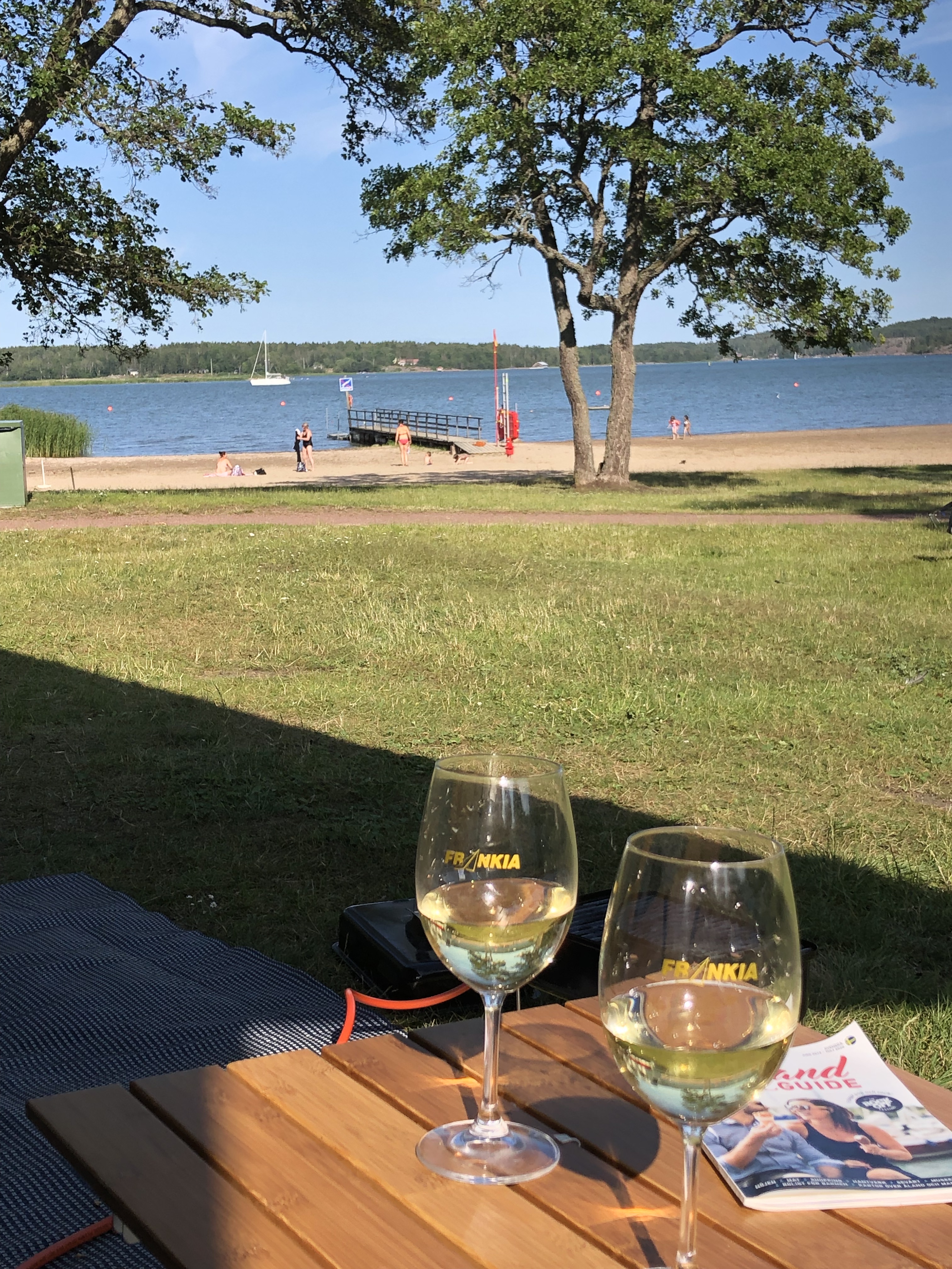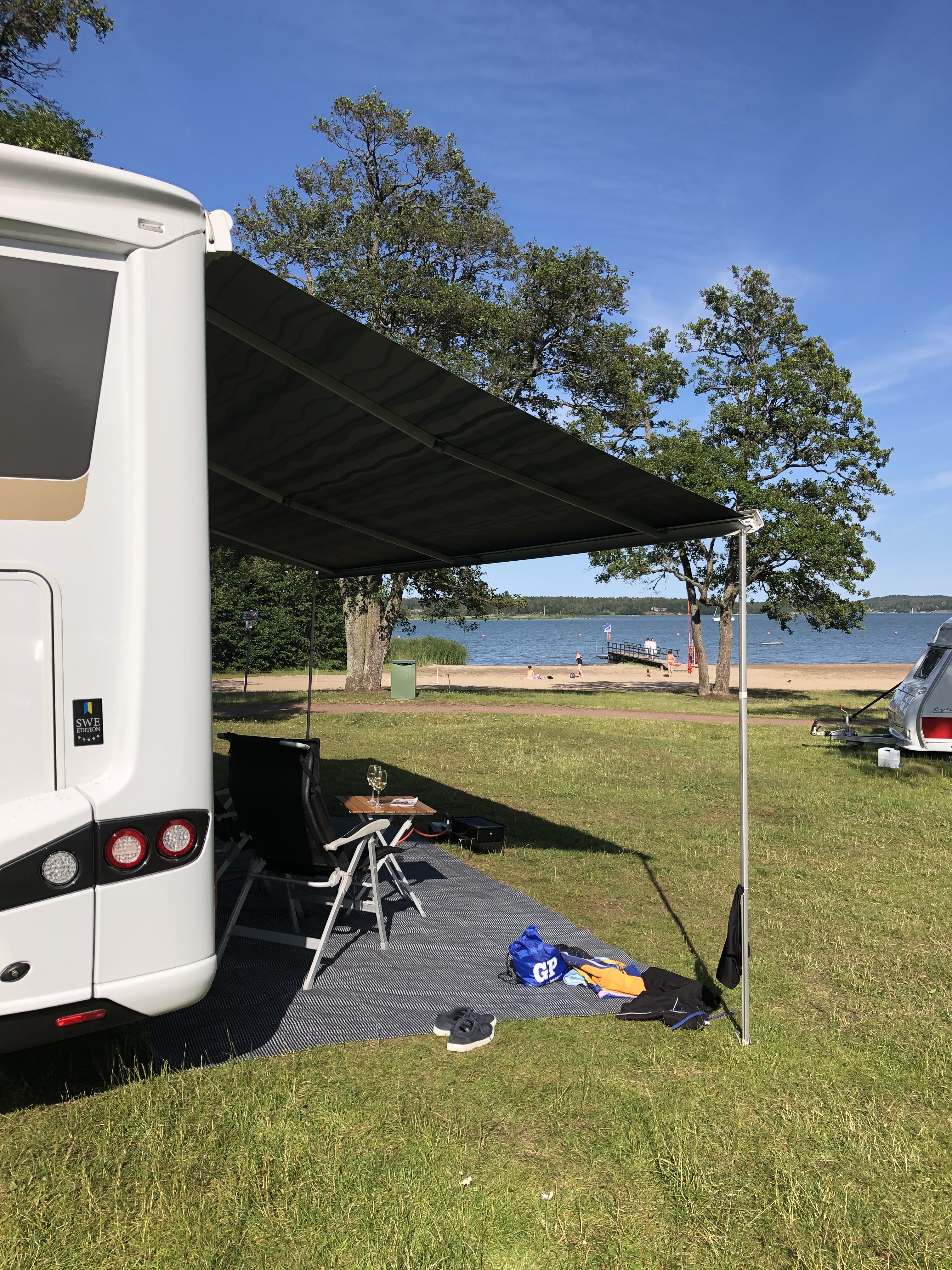 Hamnade till slut i Mariehamn och tog in på stadens enda camping. Vi fick välja plats och eftersom vi inte är beroende av el valde vi strandnära (de flesta husbilar och husvagnar stod på rad längre bort)