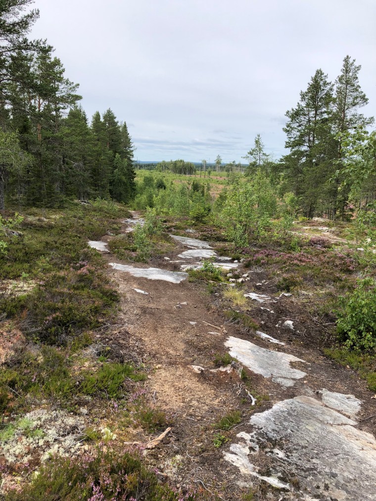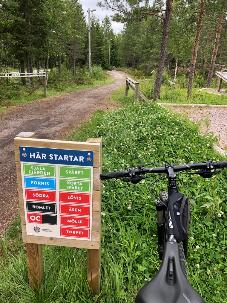 Vi väljer blå bana och tur var nog det. Vi inser att vi är dåligt tränade och inte alls vana att köra på sten och stubbar. Fick mersmak för det är ju så roligt.