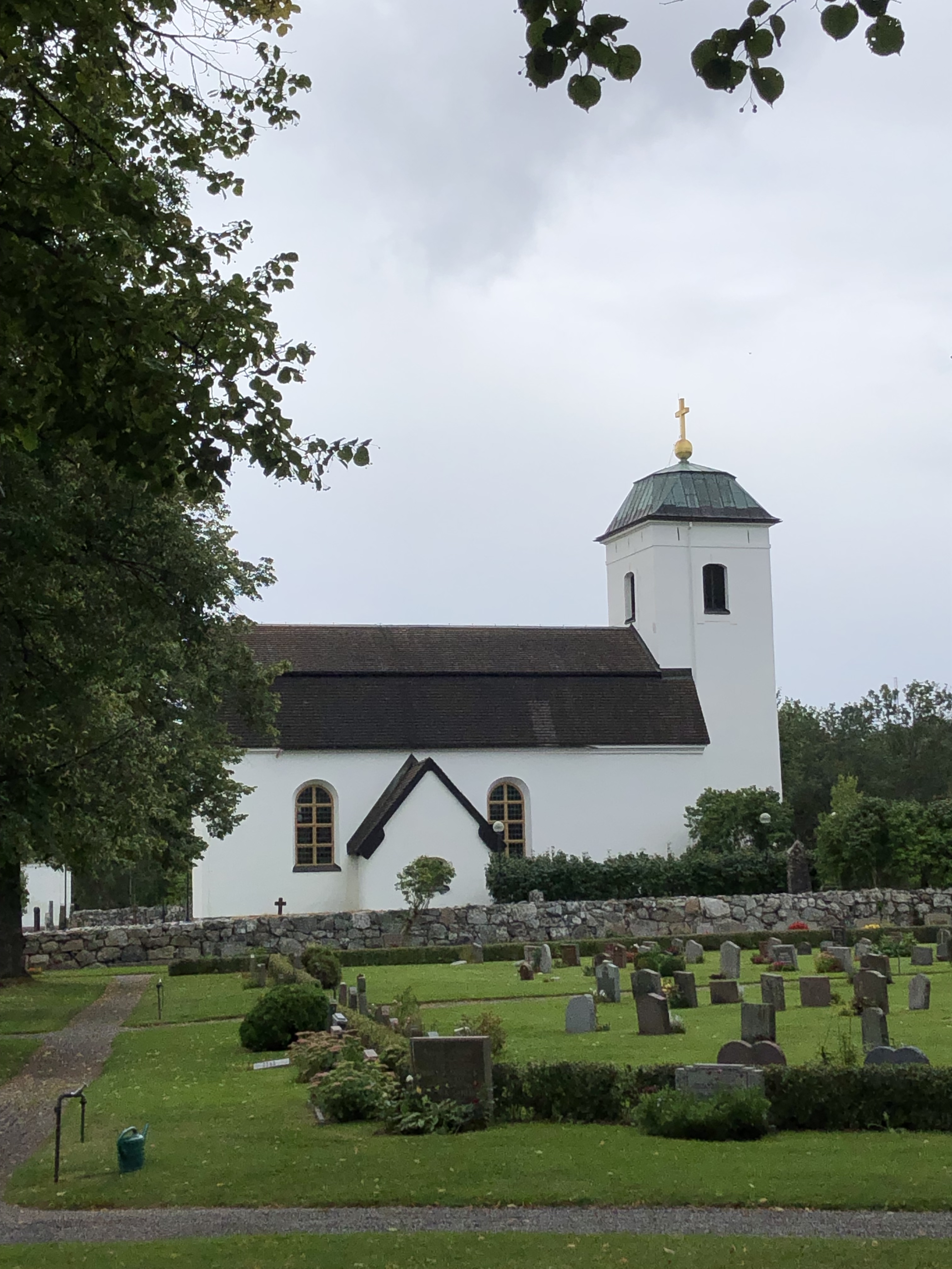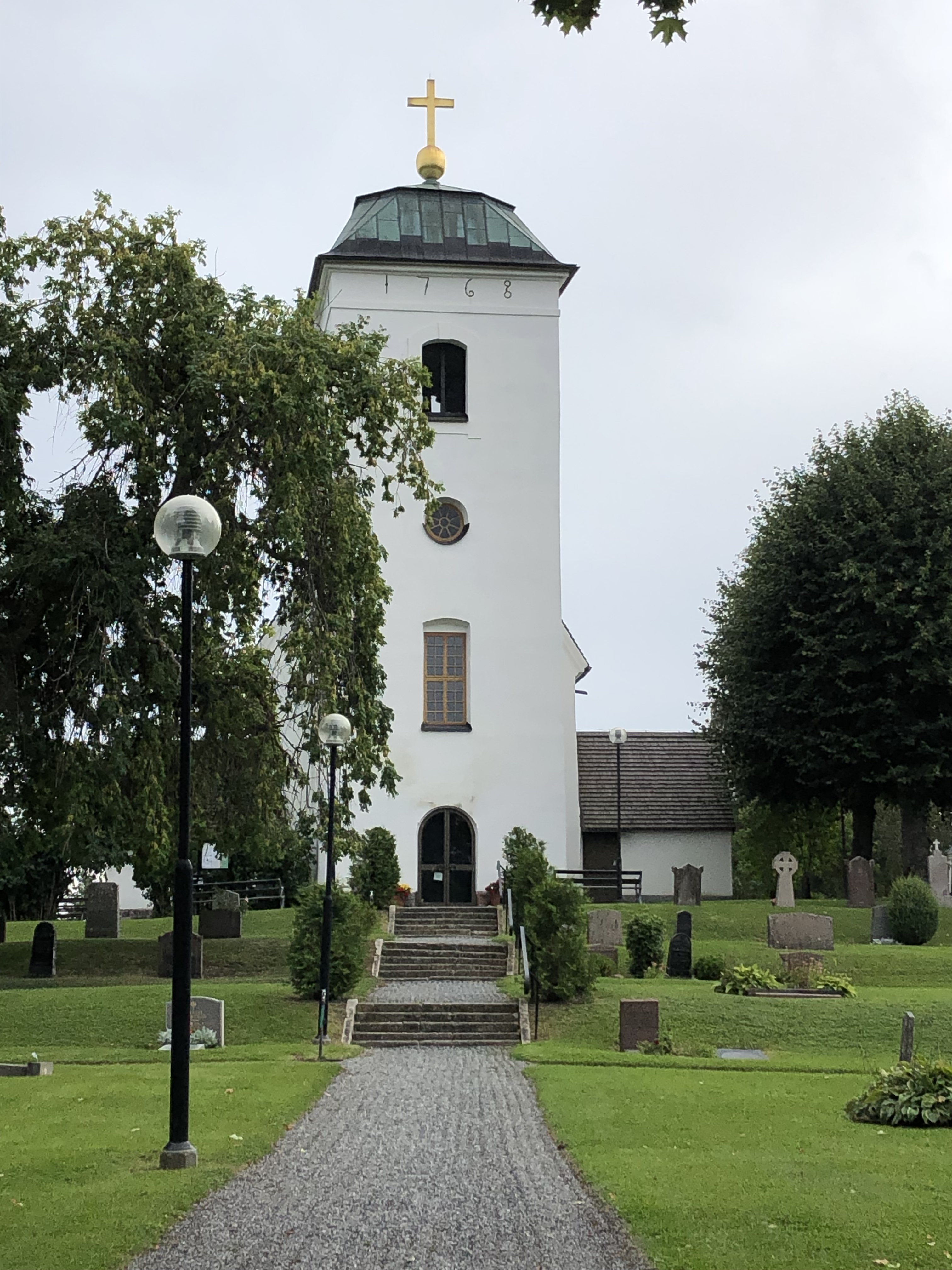 Så småningom kommer vi till Eds Kyrka som är Väsbys äldsta kyrka och byggdes på medeltiden. Grusgångarna är tydligt och fint krattade och jag nämnde det för en kille som passerade på sin hundpromenad och han berättade att det är alltid fint krattat här. Det blev jag glad av att höra. (Är det ett ålderstecken?)