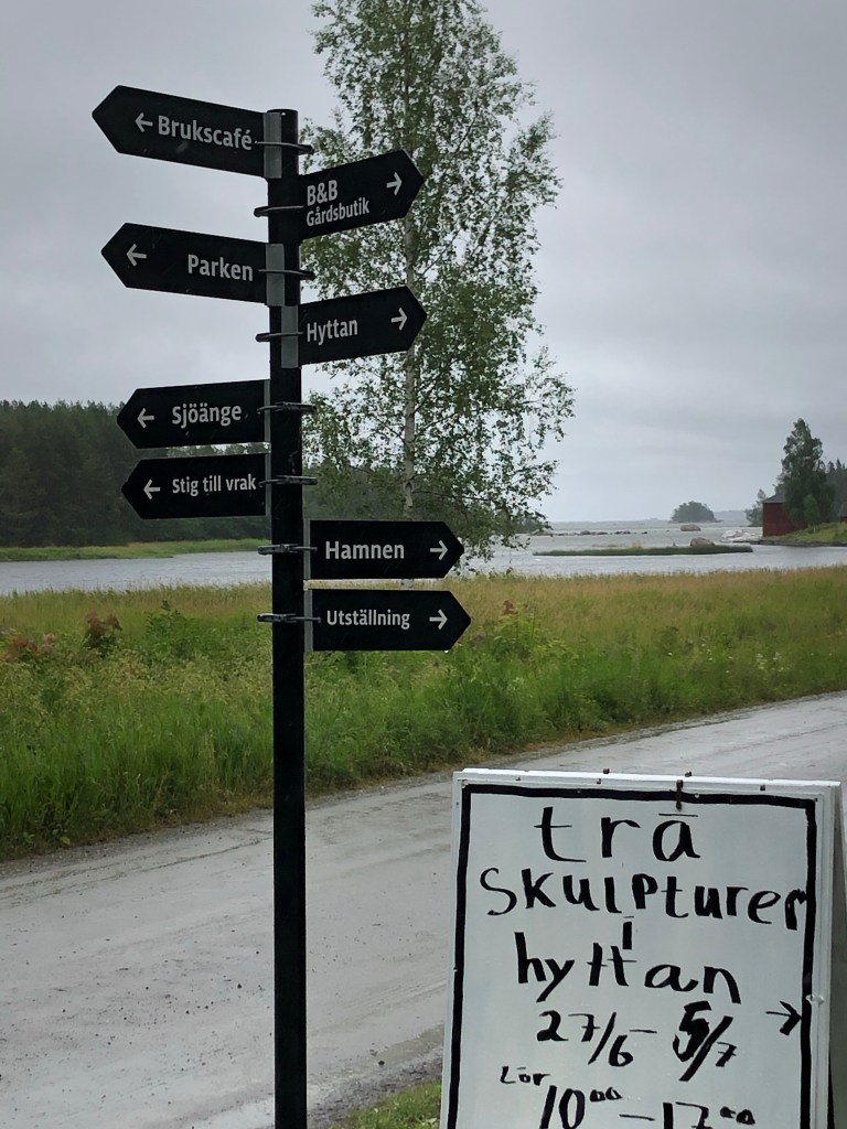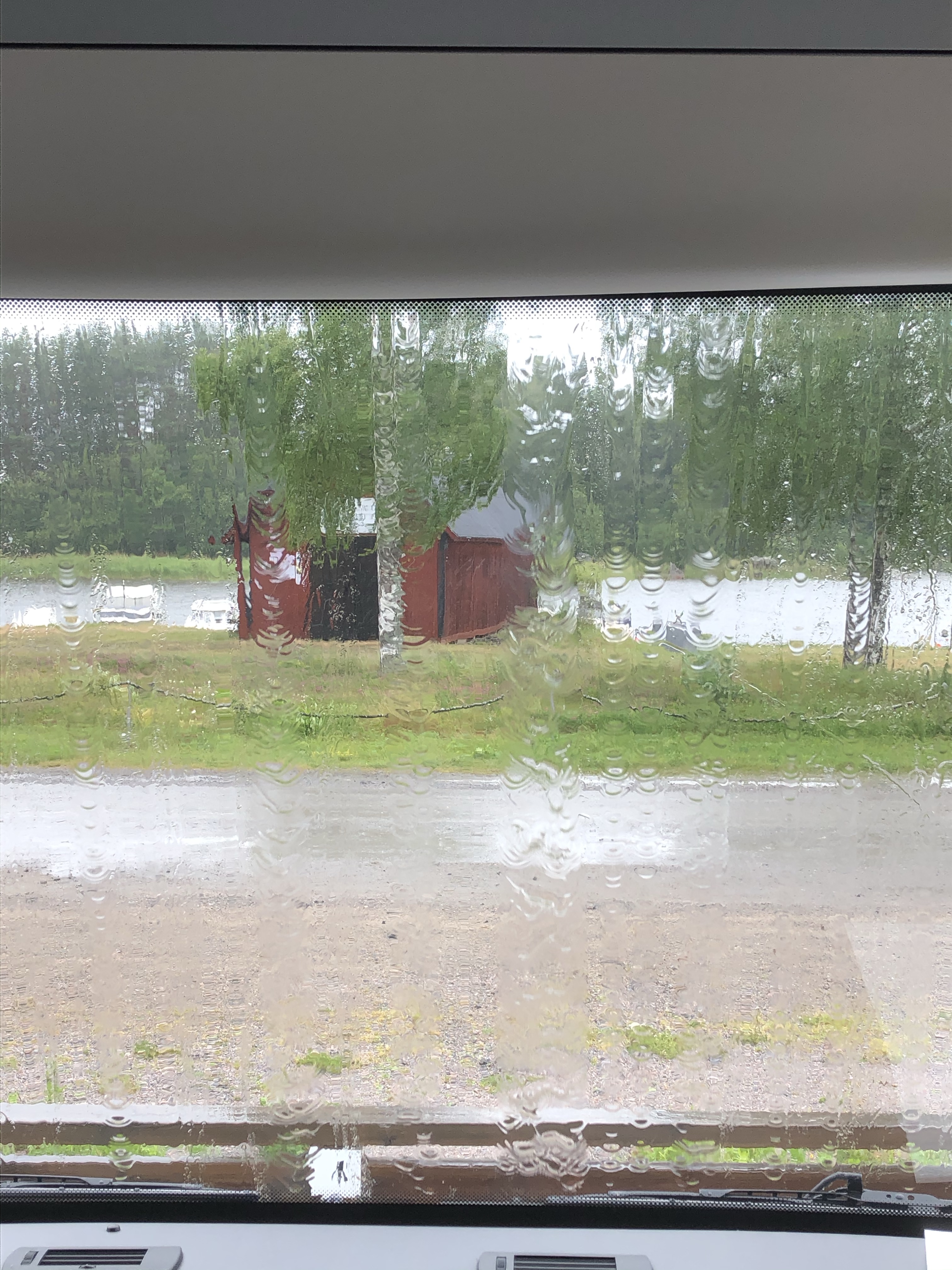 Åker in vid ställplatsen till Axmar Brygga i ösregnet. Det står reserverat nästan överallt, men vi hittar en plats och parkerar där.