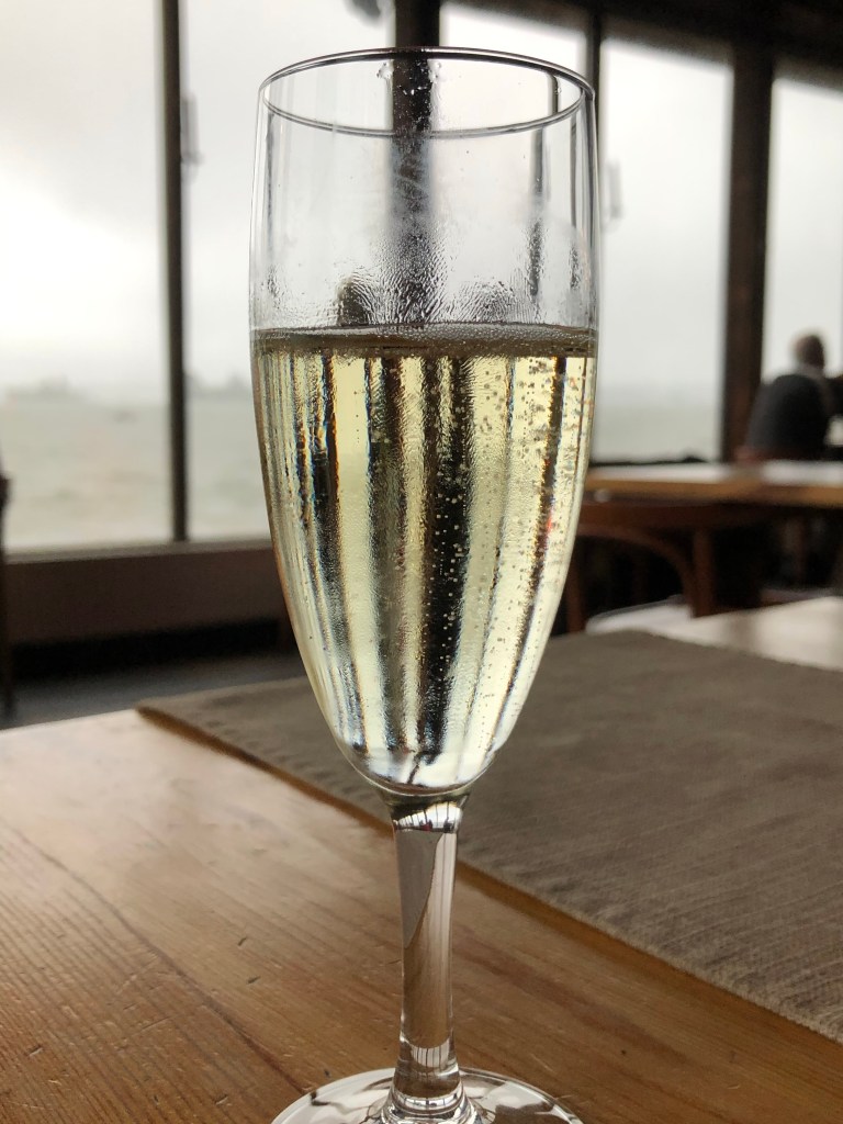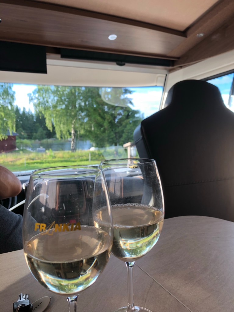När vi betalade ställplatsen kom det automatiskt upp en förfrågan om vi ville äta i restaurangen och det ville vi. Vi fick ingen bekräftelse och går till Restaurangen för att äta och det står en skylt att det är fullt. Vi fick ändå en plats och beställde in varsin 3-rätters och vinpaket till samt en fördrink. Personalen var trevlig och maten ok…hade önskat lite mer av maten. Vi tog olika maträtter men vi båda tyckte att efterrätten var bäst.