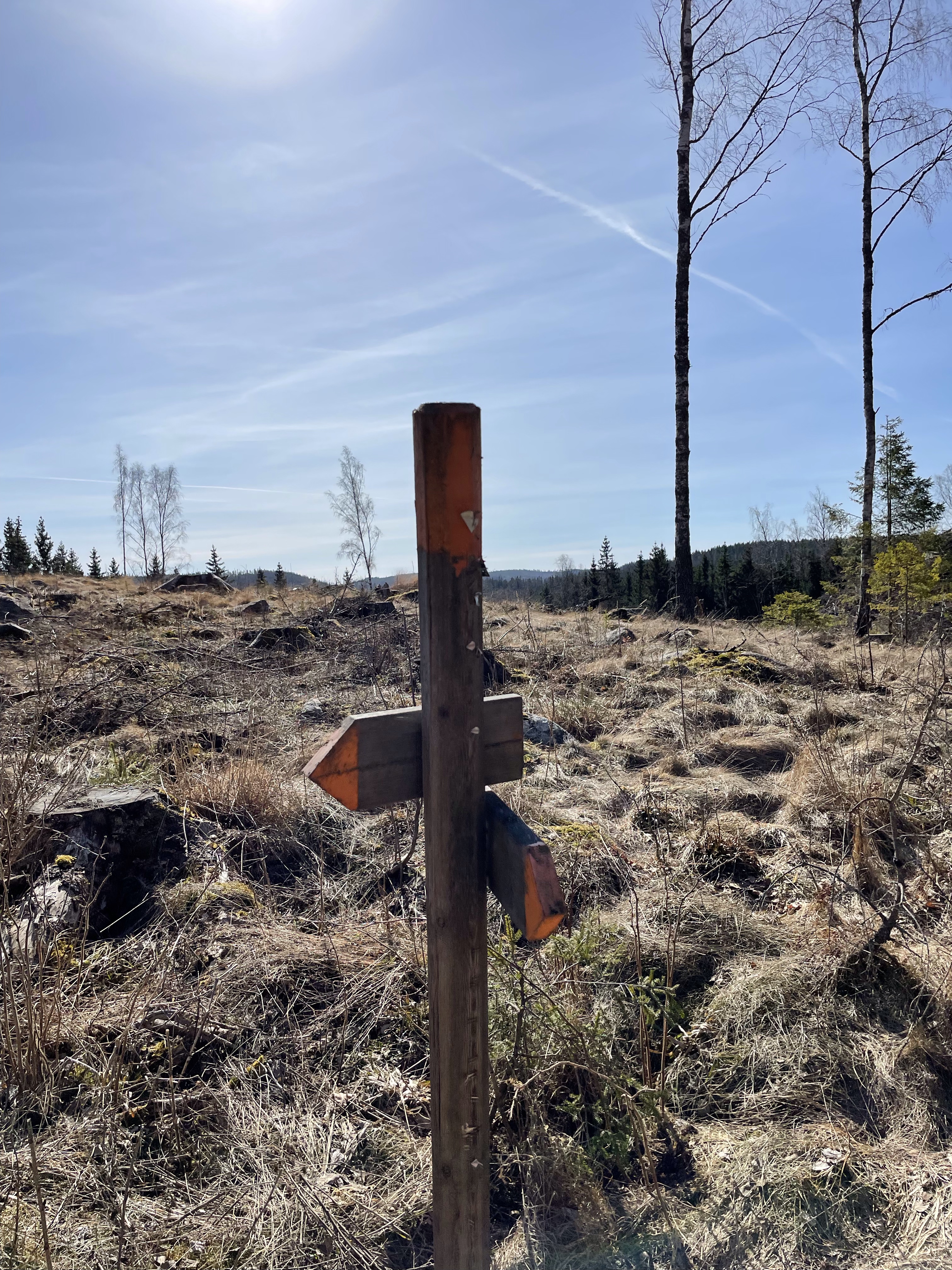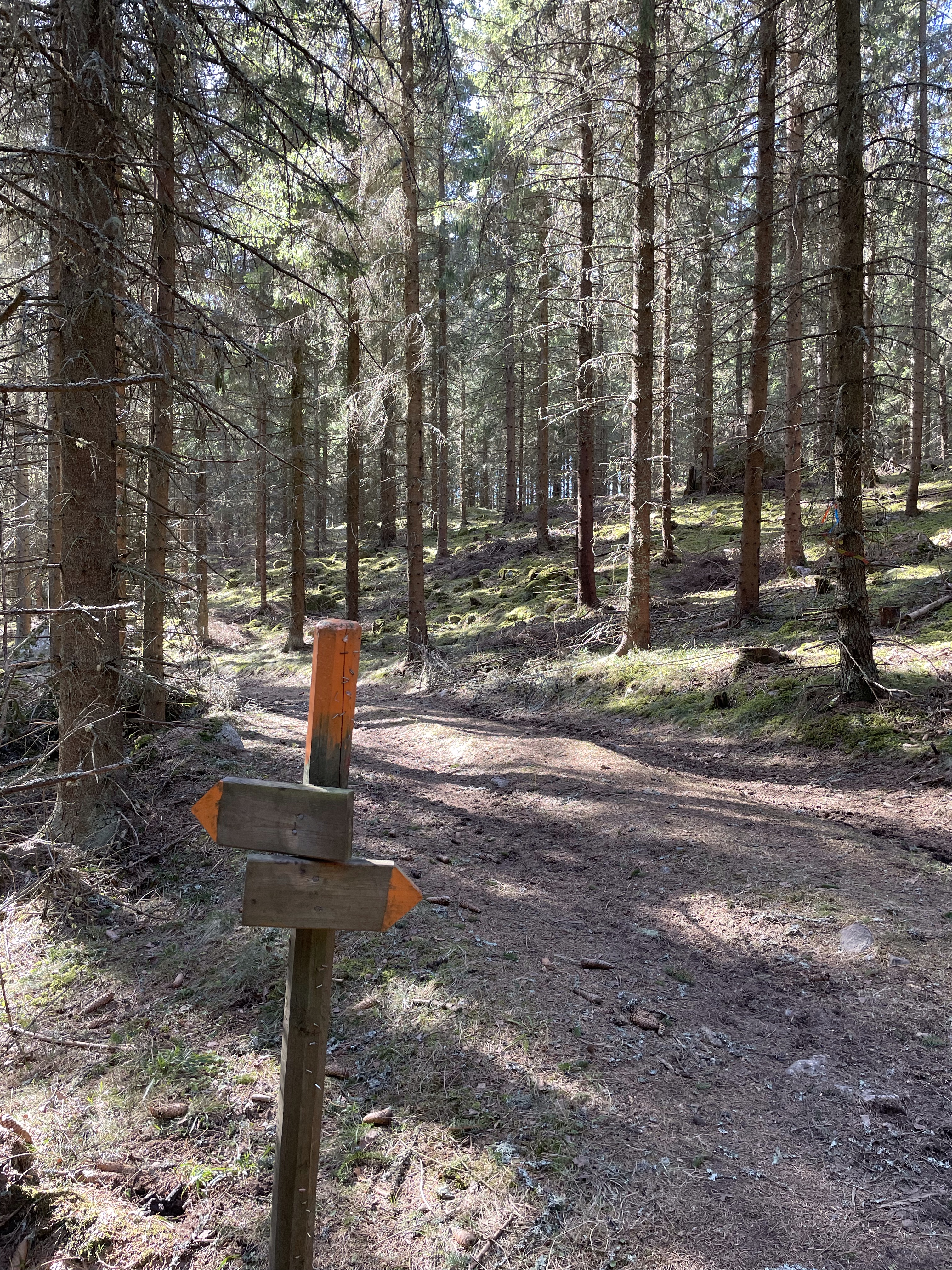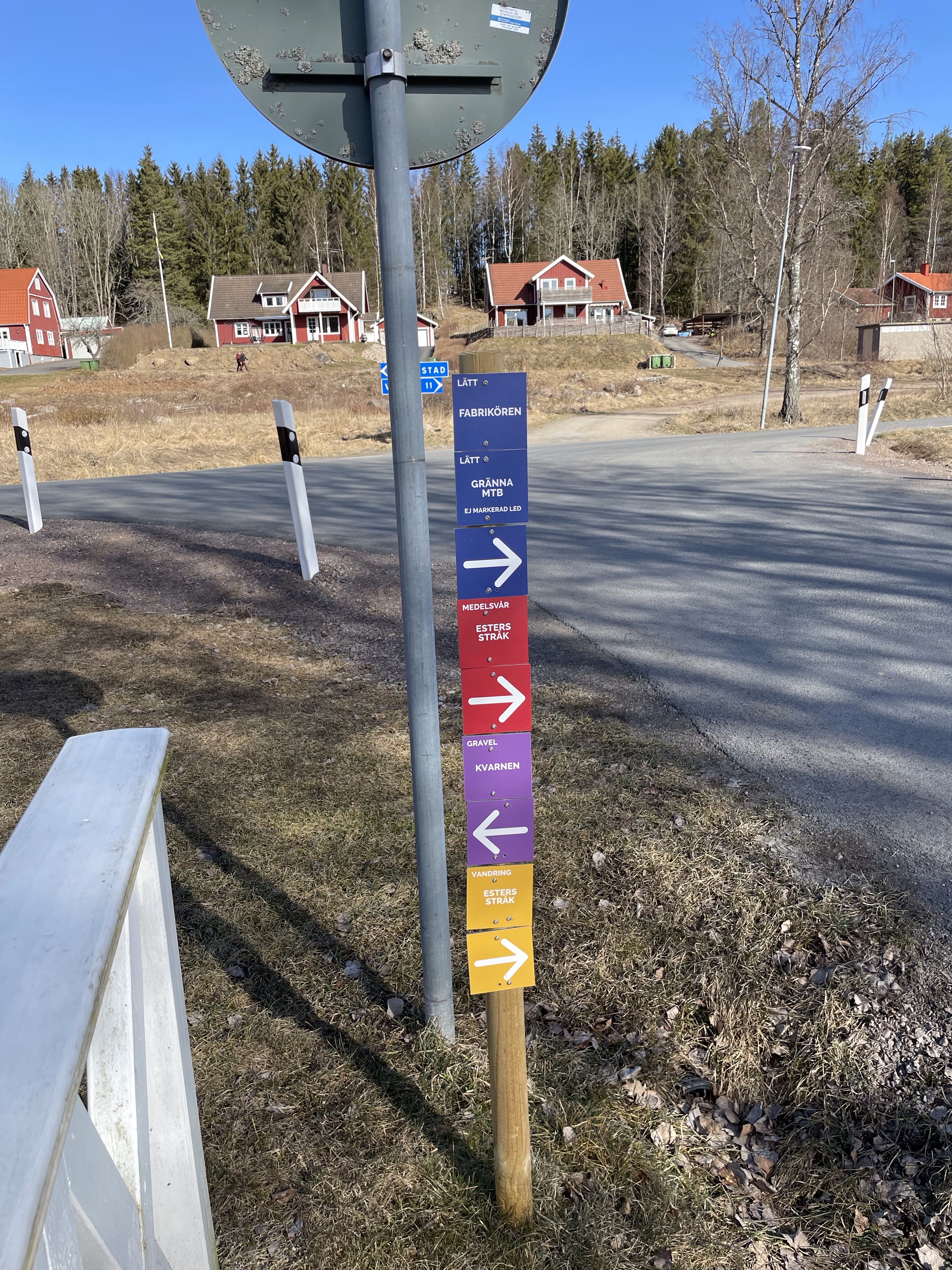 I Receptionen hämtade vi en karta över Cykel & Vandringsleder. På lördagen bestämde vi oss för att springa en led som beskrevs – En härlig och något krävande rutt med många långa backar som i slutet bjuder på en oslagbar utsikt över sjön som kompensation. Leden heter Kvarnen och är 14 km och mestadels grusväg. Första skylten visar att vi ska springa efter vägen vi åkte på igår…