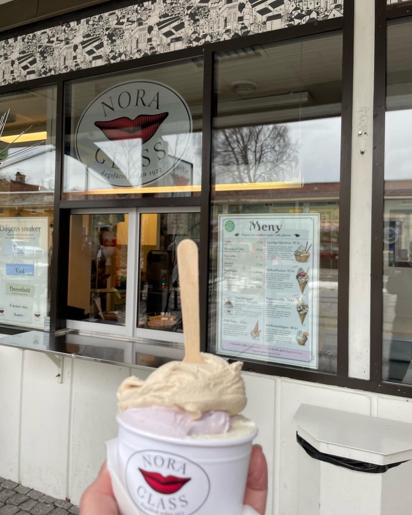Nora glass öppnade för säsongen kl.12, så det var ju bara att passa på när det är säsongspremiär. Dagens smaker var vanilj, hasselnöt och viol, inga smaker jag skulle komma på tanken att välja, men det smakade bra i kylan.