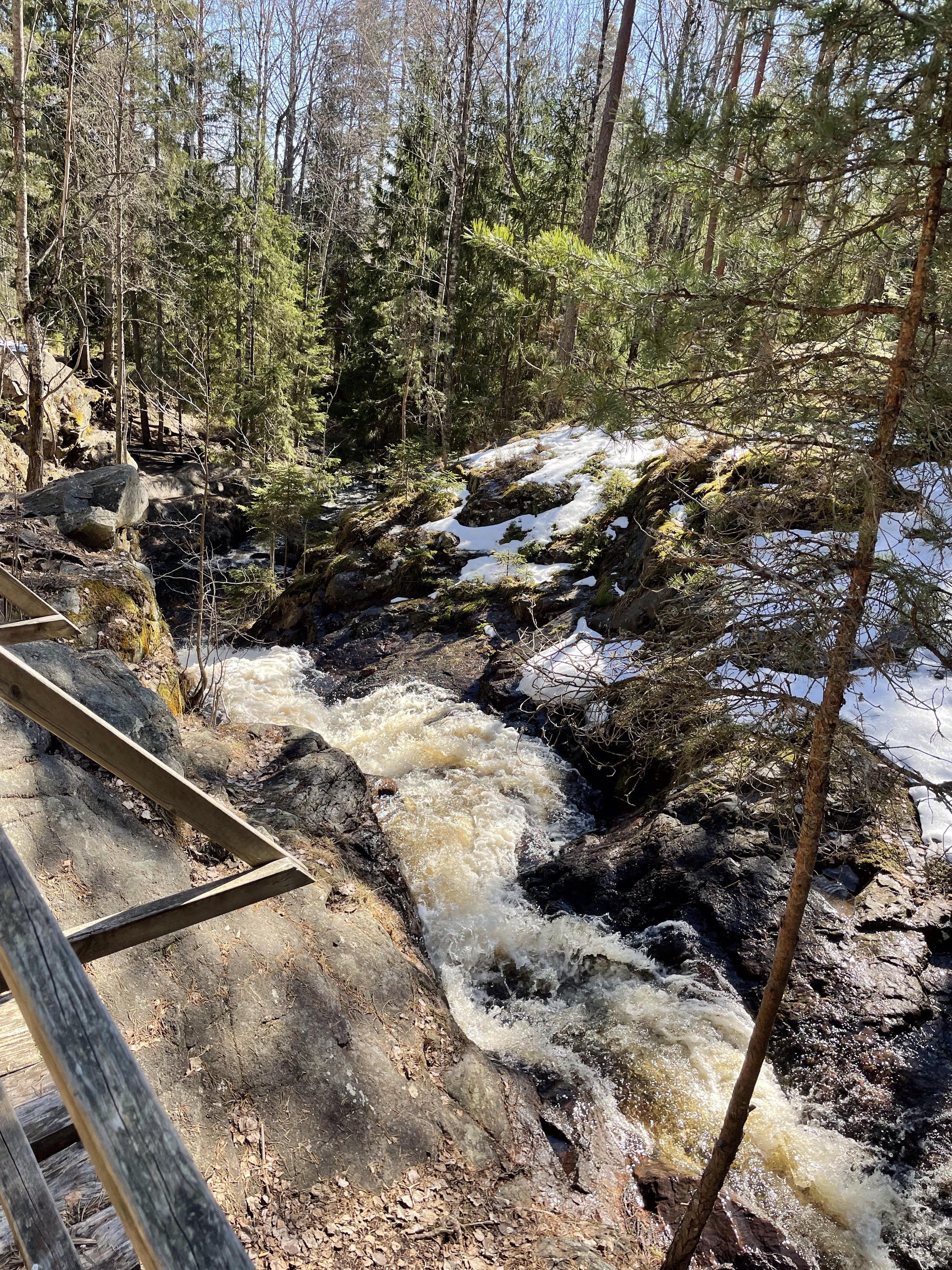 Vi springer uppför och hör ljudet från vattnet som dånar hela tiden.