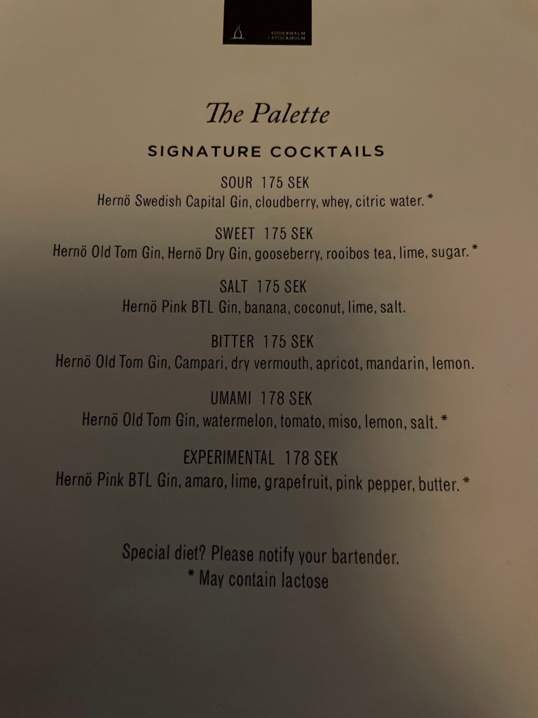 Behöver jag ens berätta varför vi valde att gå in här. Vi fick tips om Experimental som jag gillade skarpt, men inte mannen. Fråga inte mig om innehållet… Bartendern berättade, men jag minns inte vad han sa om smöret som legat i 48 timmar, eller något sånt. Borde väl helt enkelt gå dit igen och kanske boka en provning.
