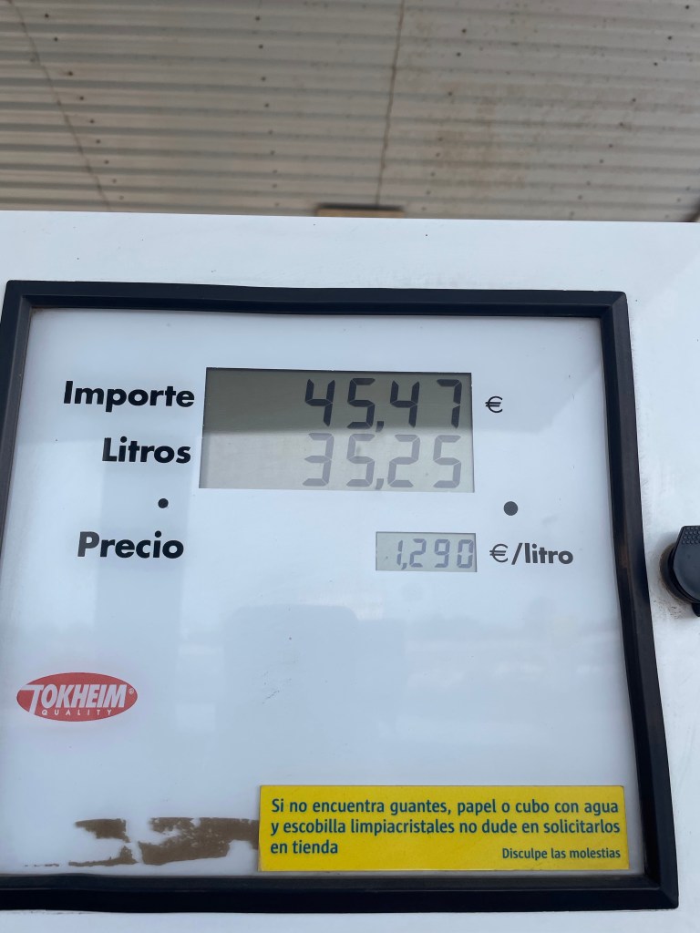 Mars 2023 betalade vi för en bil till 4 pers ca: 70 euro och för bensin 1,29 €/liter (vi ”råkade” fylla på mer än vi borde. Inte lätt att fylla 1/2 tank)