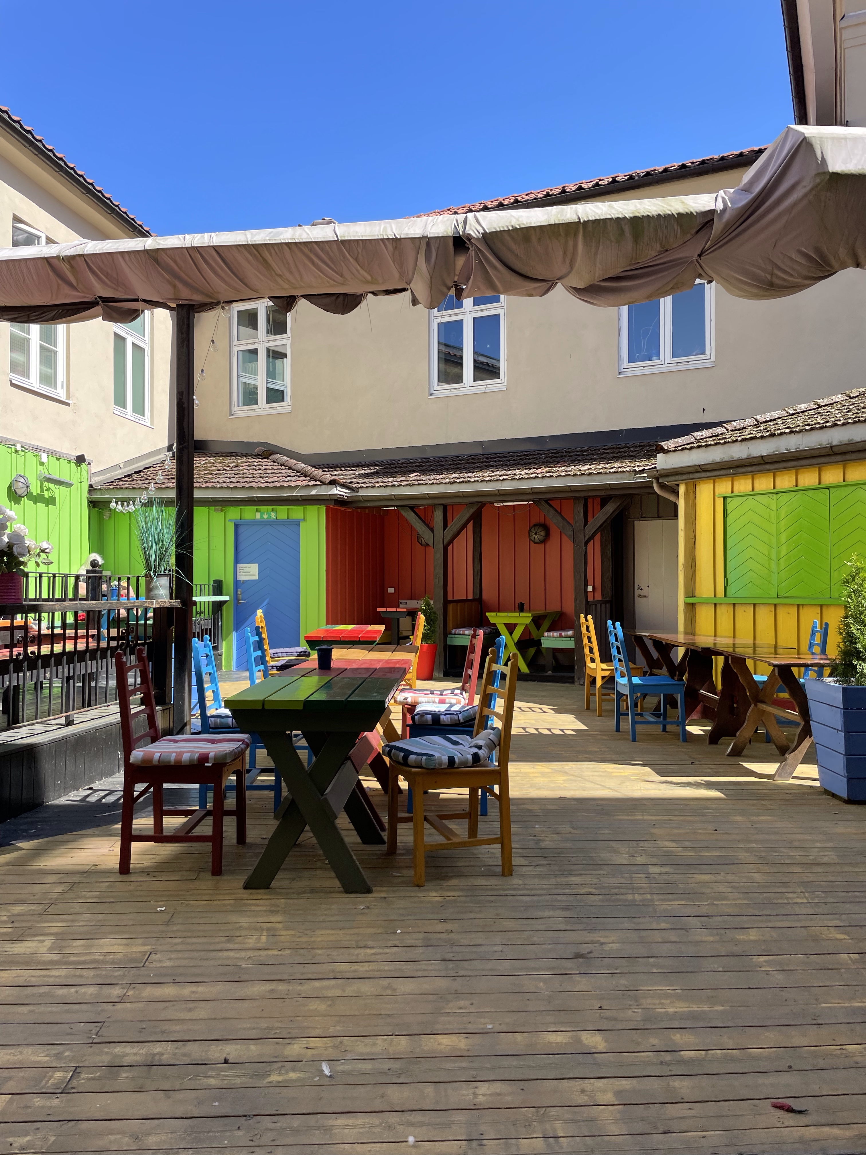 Vi fick syn på denna färgglada innegård och kunde inte låta bli att kliva in. Det visade sig vara Dickens Pub. Det ska ju vara så dyrt att ta en öl i Norge. Vi tog en varsin 50cl fatöl och betalade 180kr. Det var det klart väl.