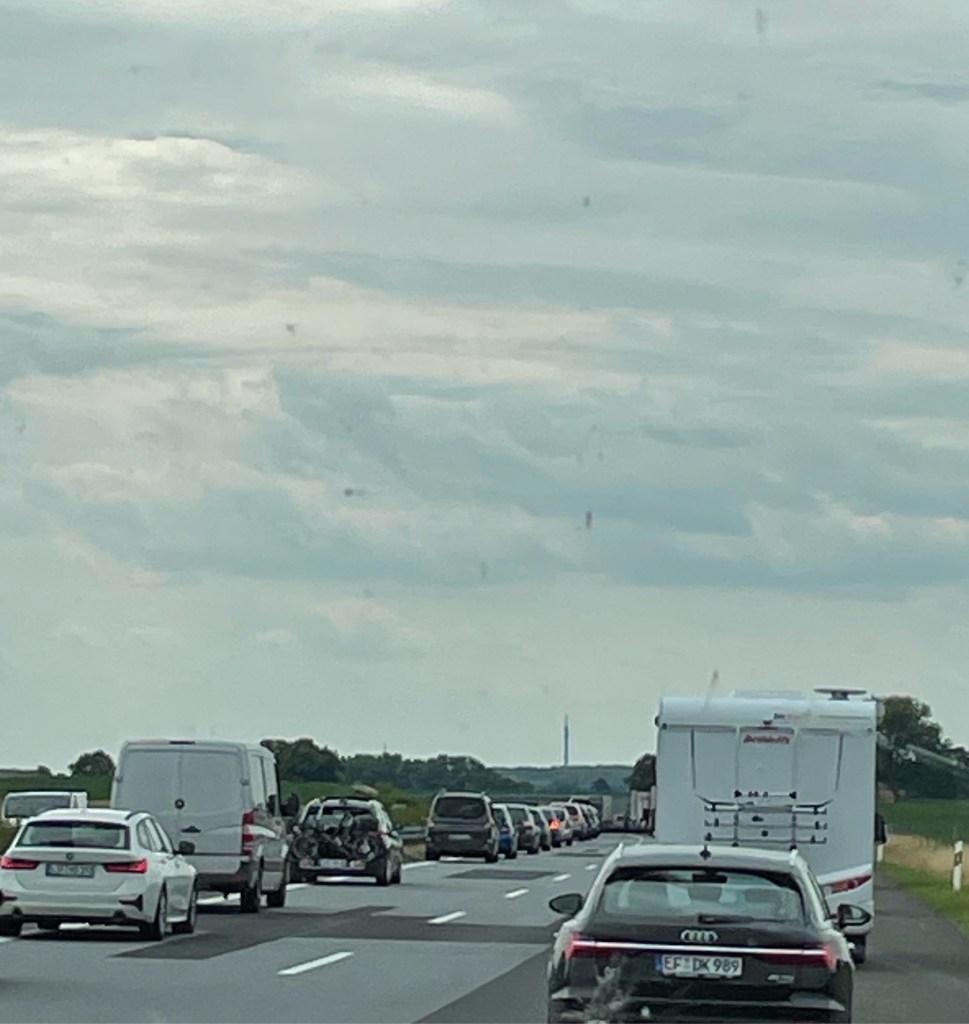 Efter en timme hamnar vi i kö, riktig kö. Tur att vi har kanelbullar, vatten och toa med oss. Vi blir sittande i kön i 4 timmar och 40 min…suck! Inte så vi planerat dagen.