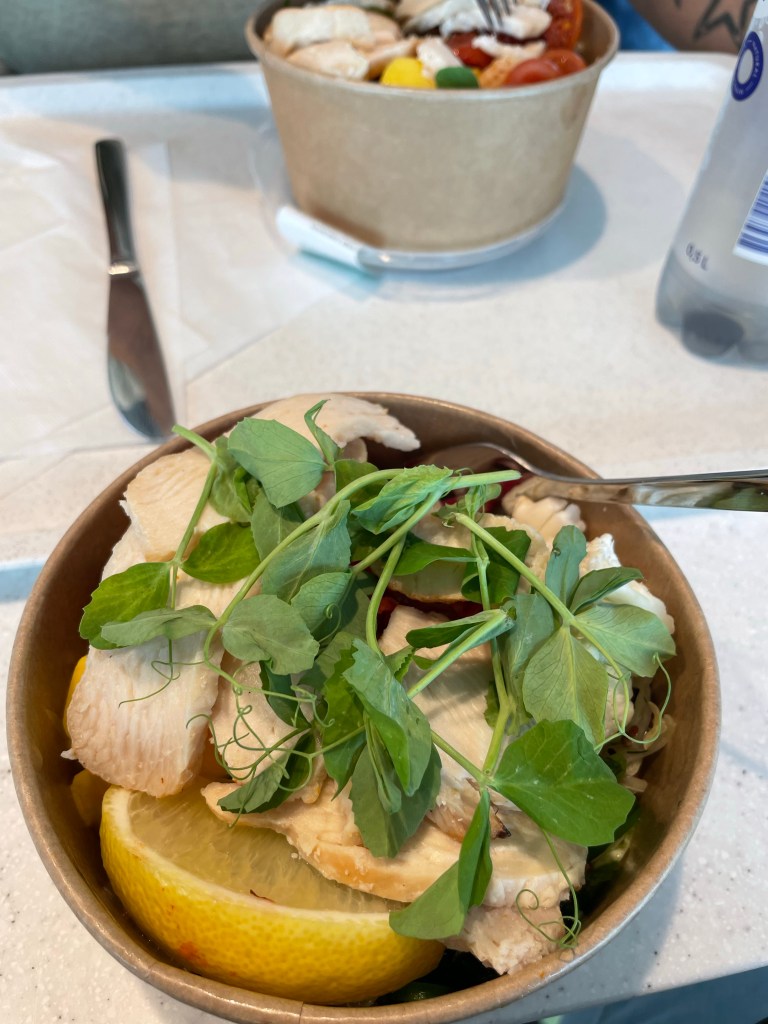Vi ställer oss snällt i kön och köper en varsin sallad och en flaska vatten. Hittar en plats att sitta på och får i oss lite mat.