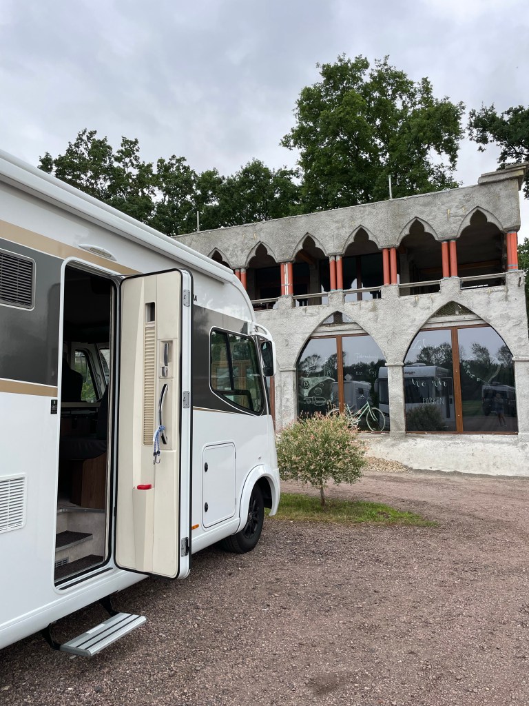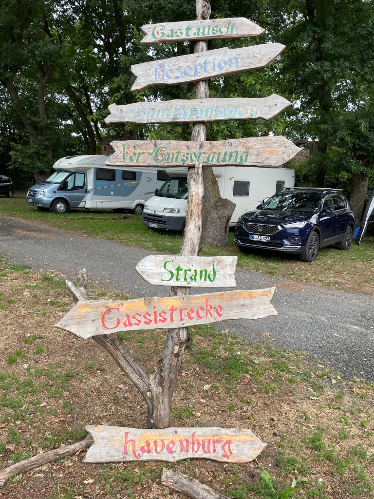 Det är en annorlunda plats vi hamnat på. Märkliga byggnader, men eftersom vi inte förstår tyska förstår vi inte någonting. Det är i alla fall rent och fräscht. Lite längre in på campingen finns ett partygäng som låter lite mer än alla andra.