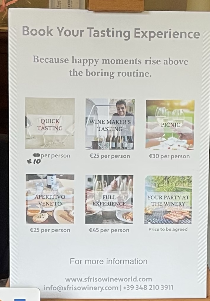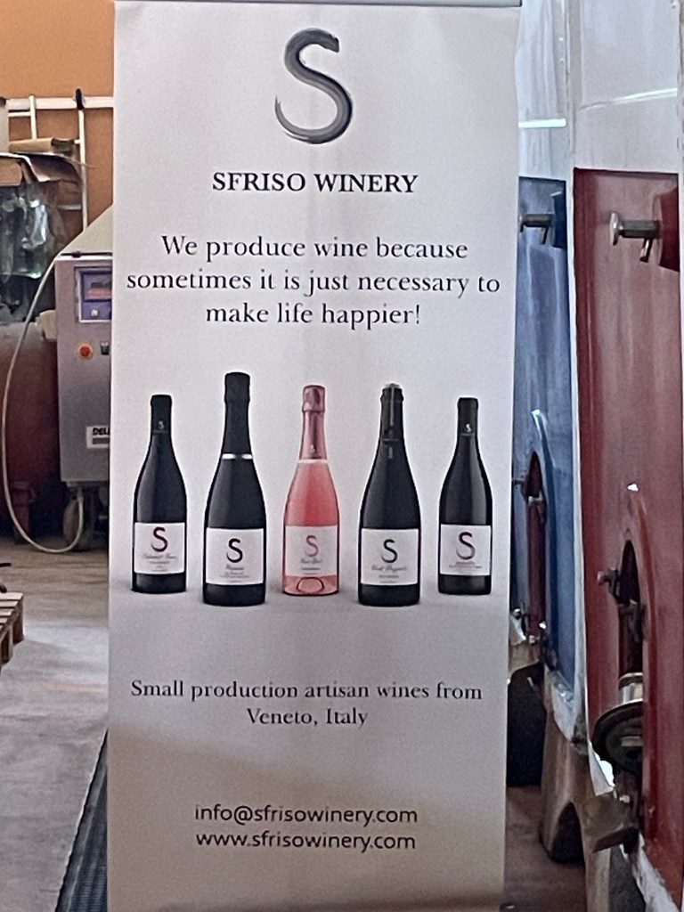 När alla gäster kommit och vi druckit ännu mera Prosecco Rosé går vi in och vinprovningen startar. Pier Sfriso berättar om vinodlingen och vinerna. Han är prestigelös och säger att vinprovningar brukar vara tråkiga. Här finns inga förhållningsregler och alla gör på sitt eget sätt. Vin är ett sätt att koppla ihop människor, trivas och ha roligt.