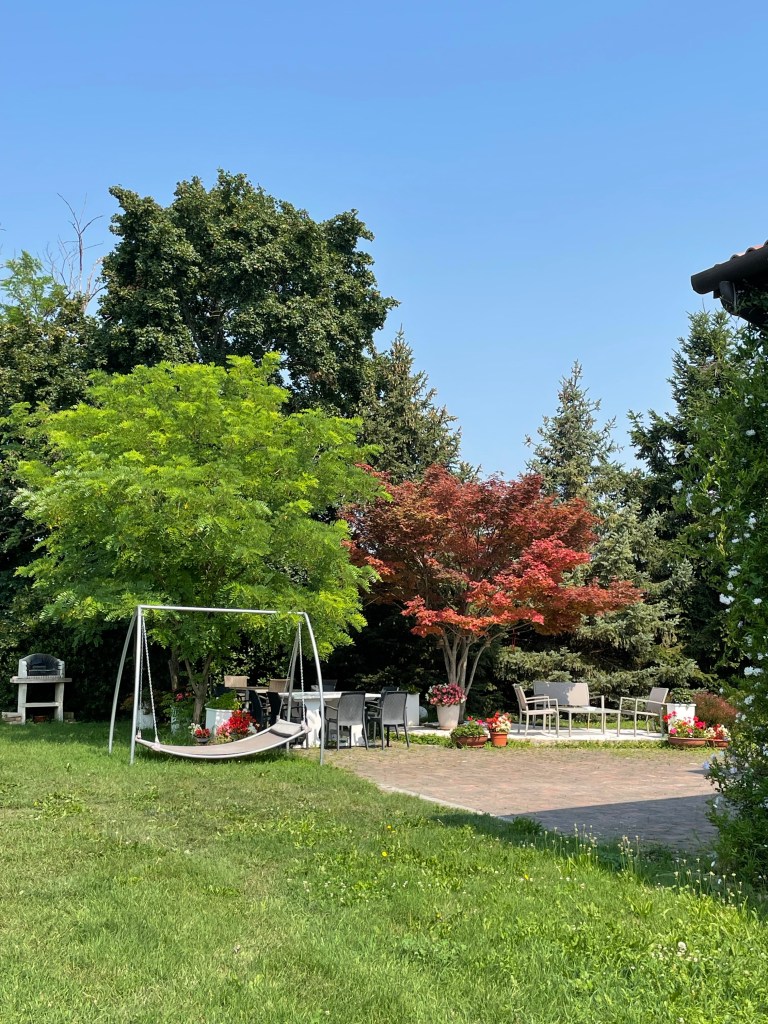 Det är så mysigt i trädgården och eftersom vi är först känner vi oss som hemma och sätter oss här med lite vin. Hoppas inte Pier ser att jag har isbitar i mitt, hehe. Får man göra så?