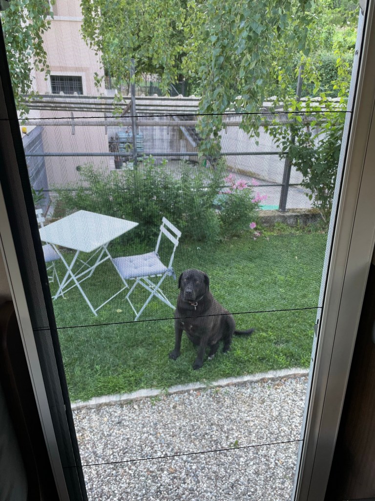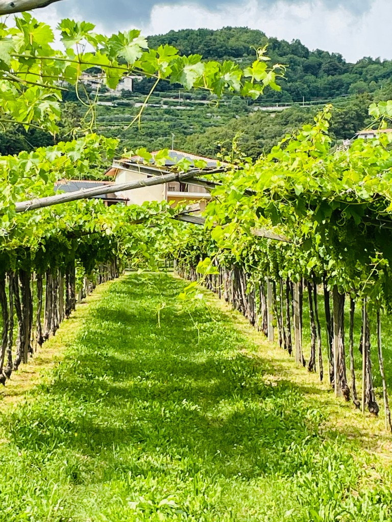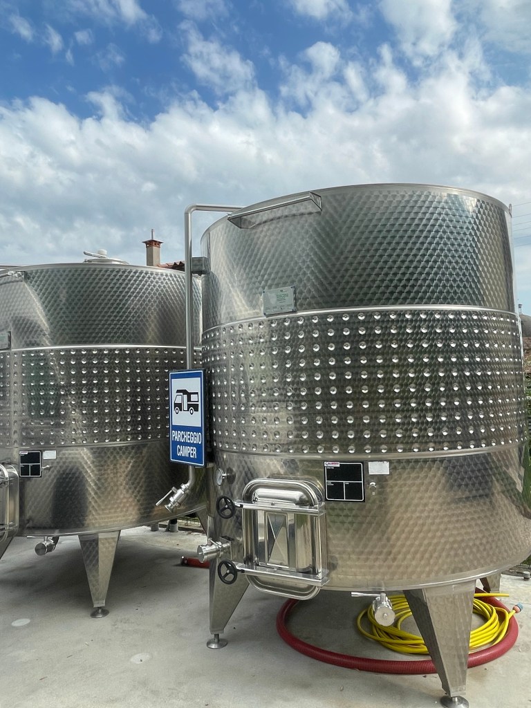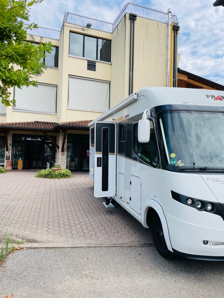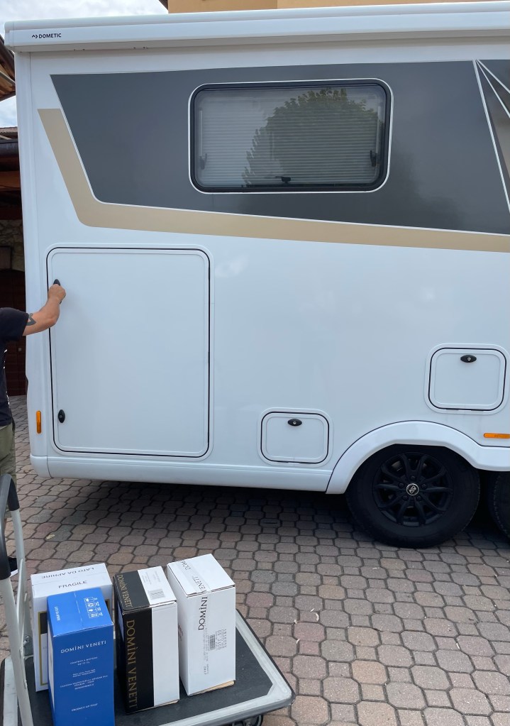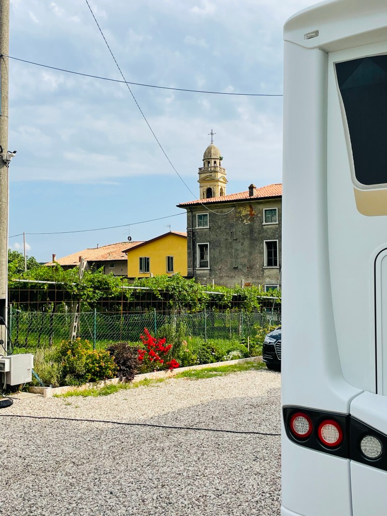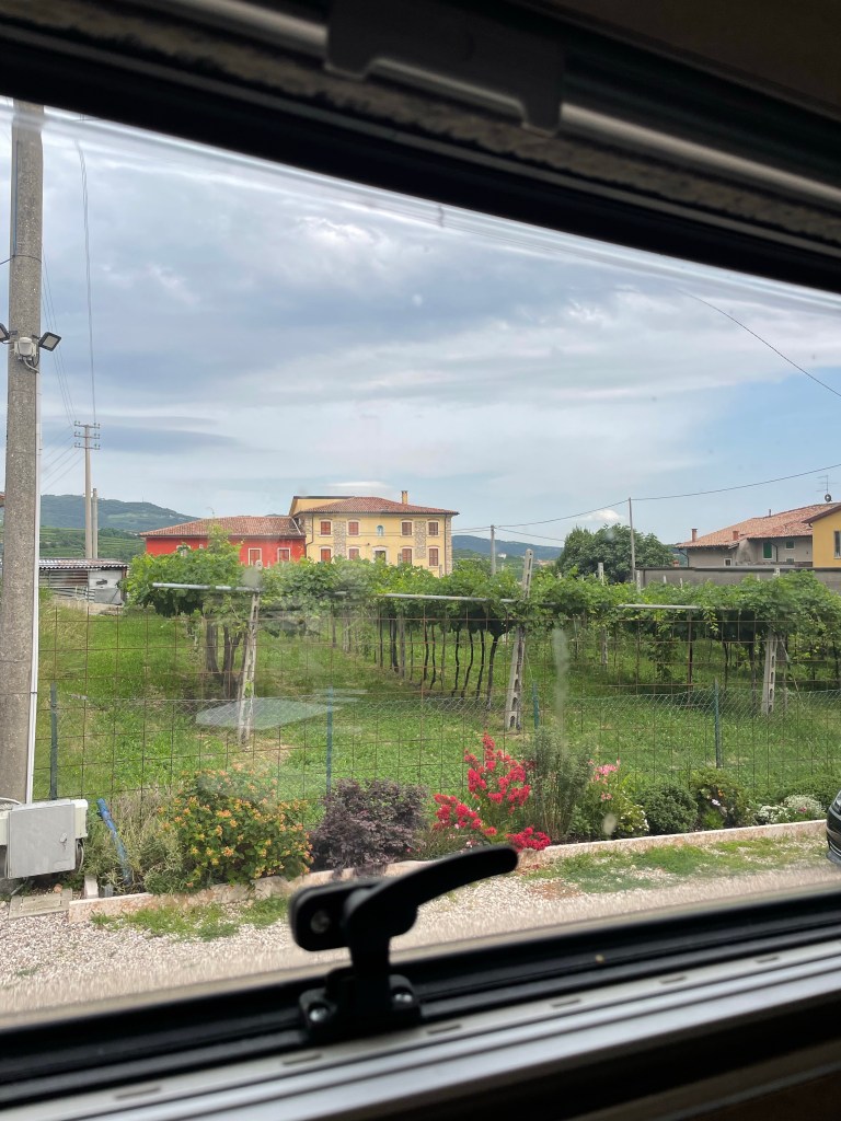 Vi har bokat plats för övernattning med husbilen via Agricamper hos Cantina cá Matta i Marano di Valpolicella. När vi kommer fram säger de -”Oj, vad stora Ni är”, men det är inga problem. Vi får bo framför ena huset längre in på gården.