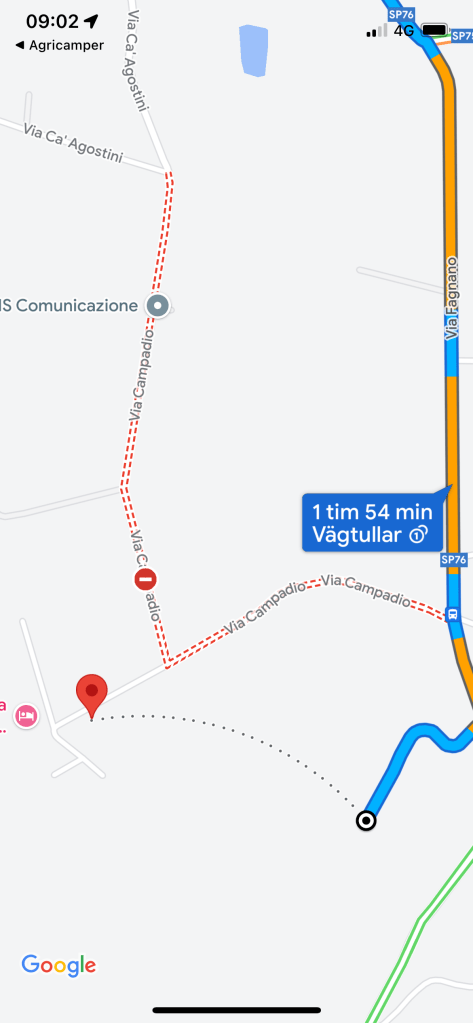 Jag ringer numret som står på Agricamper och kvinnan verkade jätteförvånad. Jag berättar vem jag är och att de accepterade våran övernattning via Agricamper. Hon berättar flera gånger vilken väg vi ska ta och vi fattade ingenting, men tackade och sa, see you soon! Vi lyckades ta oss fram, glada att vi inte fick möte för det hade inte fungerat. Italien är bäst i klassen på varnings- och förbudsskyltar och vi passerade några som vi inte förstod. Tyckte att det stod att man inte fick åka på vägen om skolbussen kommer, men det kanske var långsökt. Hursomhelst känns det som italienarna ser varnings och förbudsskyltar som ett förslag. Vi tog seden dit vi kom och körde på.
