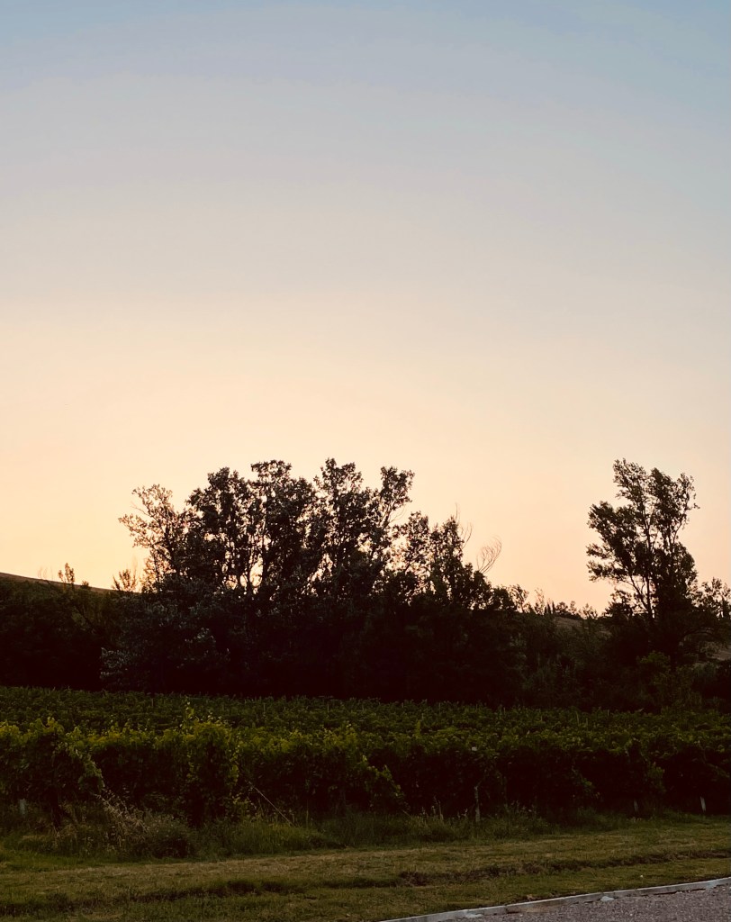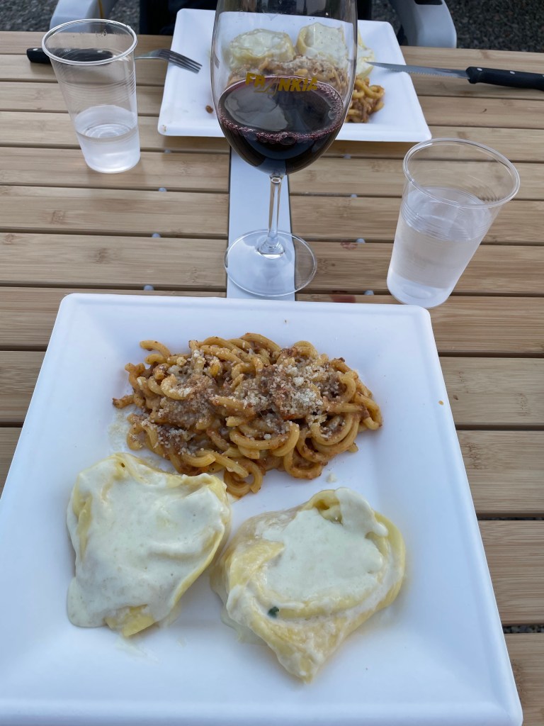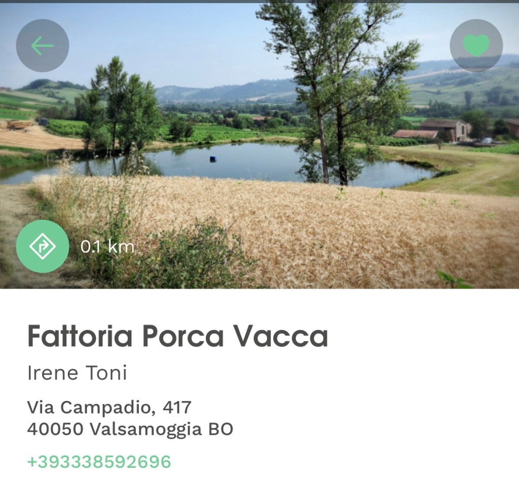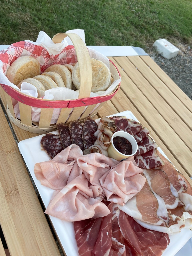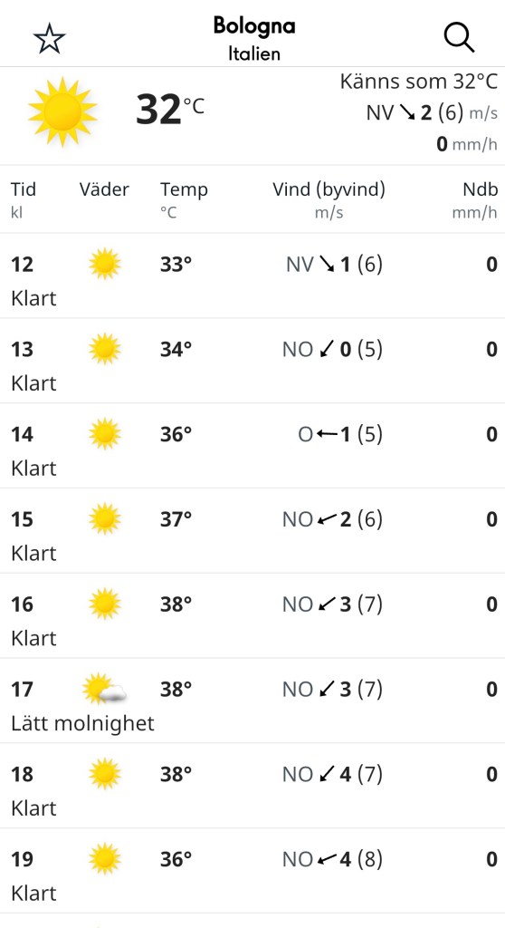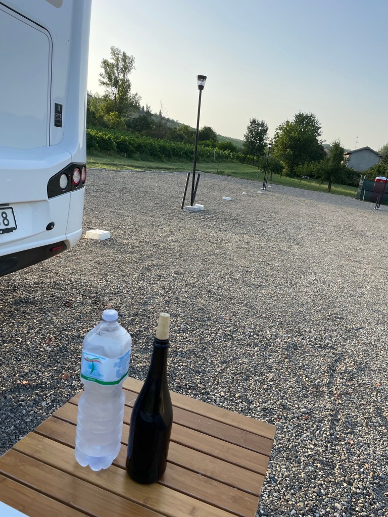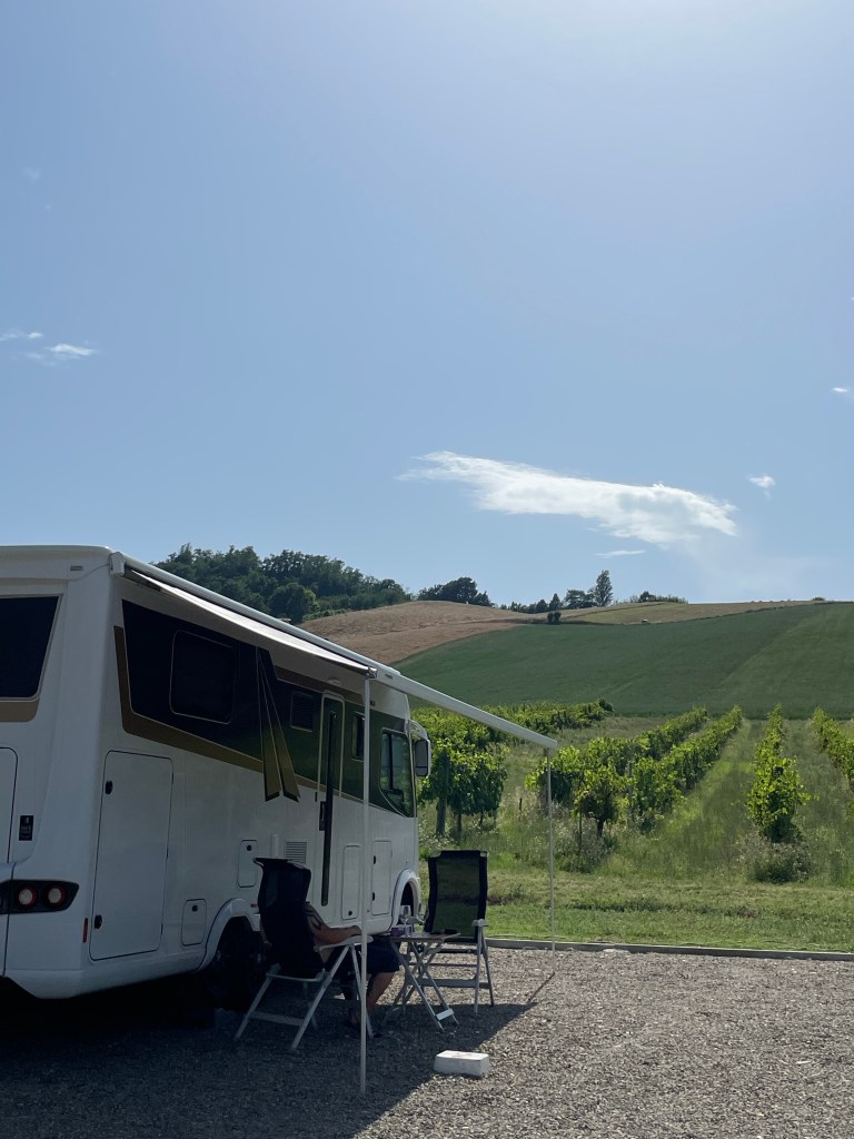 Vi bokade en bondgård via Agricamper (appen) i Valsamoggia utanför Bologna. Det vi inte visste när vi bokade var att det skulle bli jättevarmt i området och att Italienska myndigheter skulle gå ut med röd varning pga värmen. Skulle vi avboka? Nej, de har ju el så vi får väl sitta inne i husbilen i AC. Vi ville så gärna äta deras mat och dricka deras vin från gården.