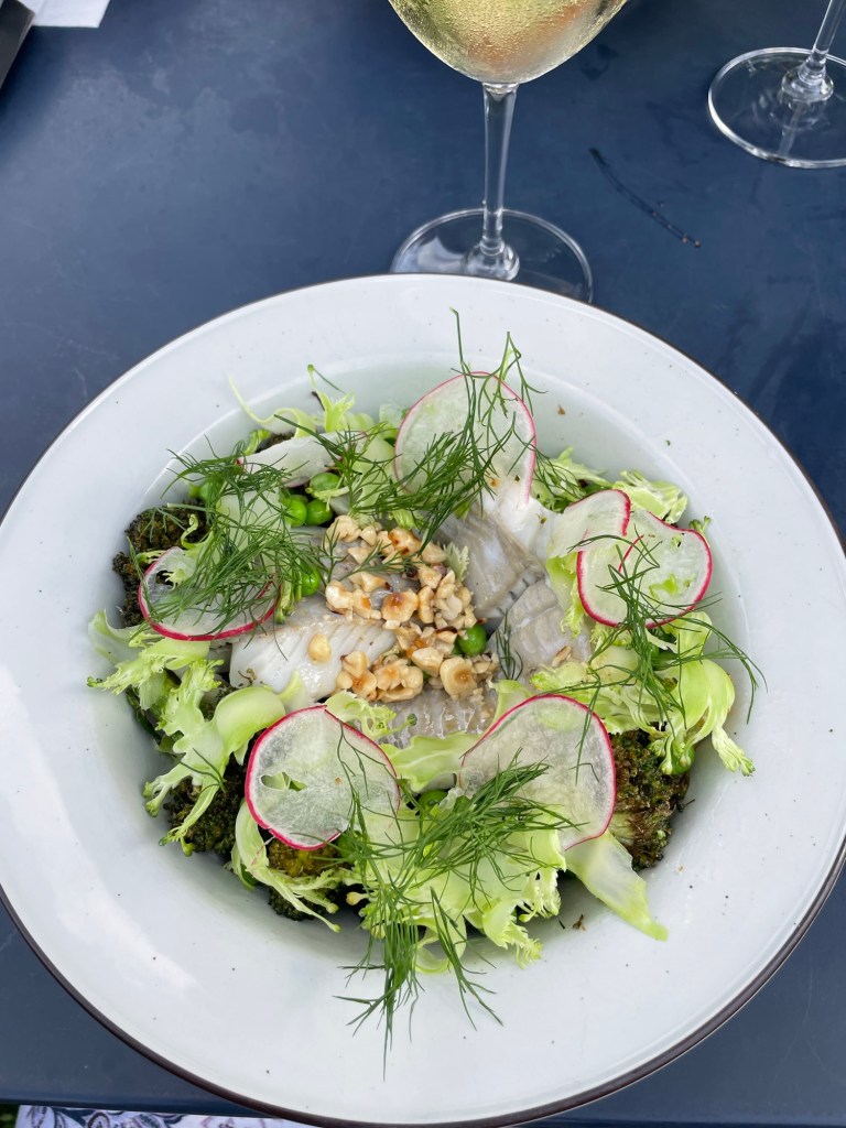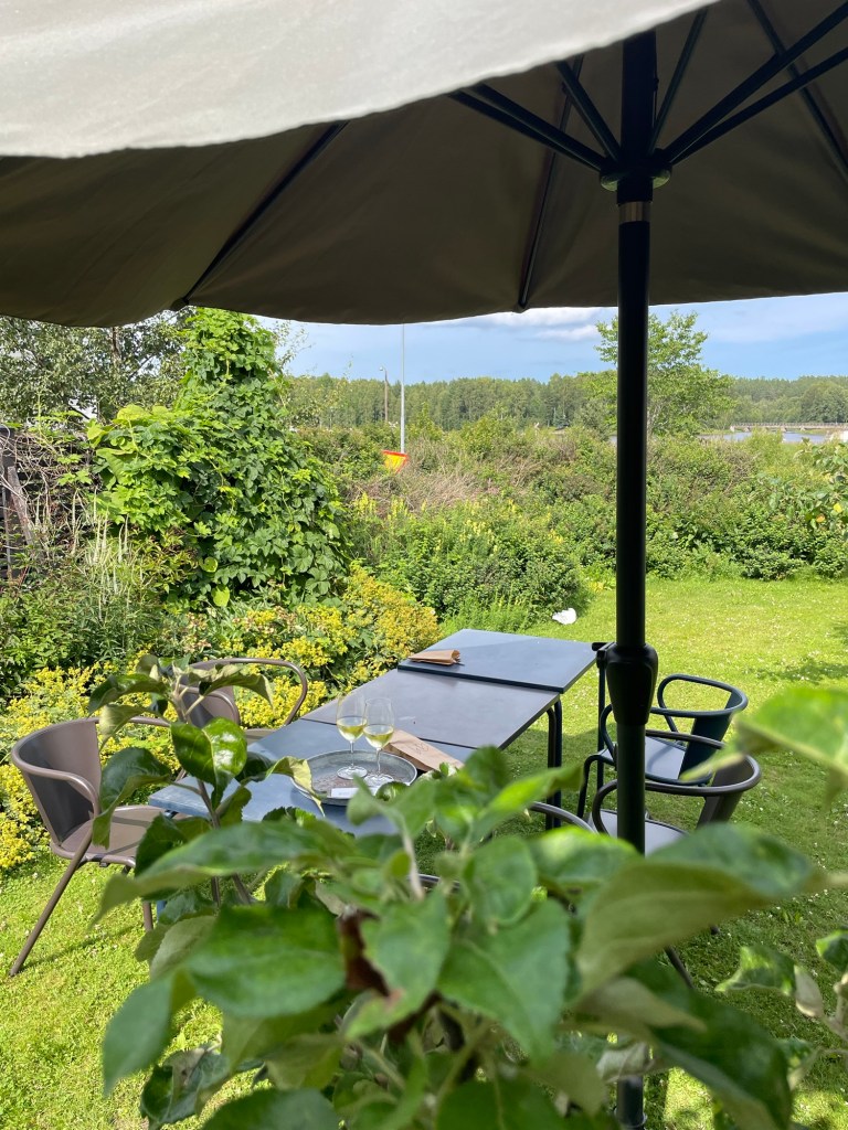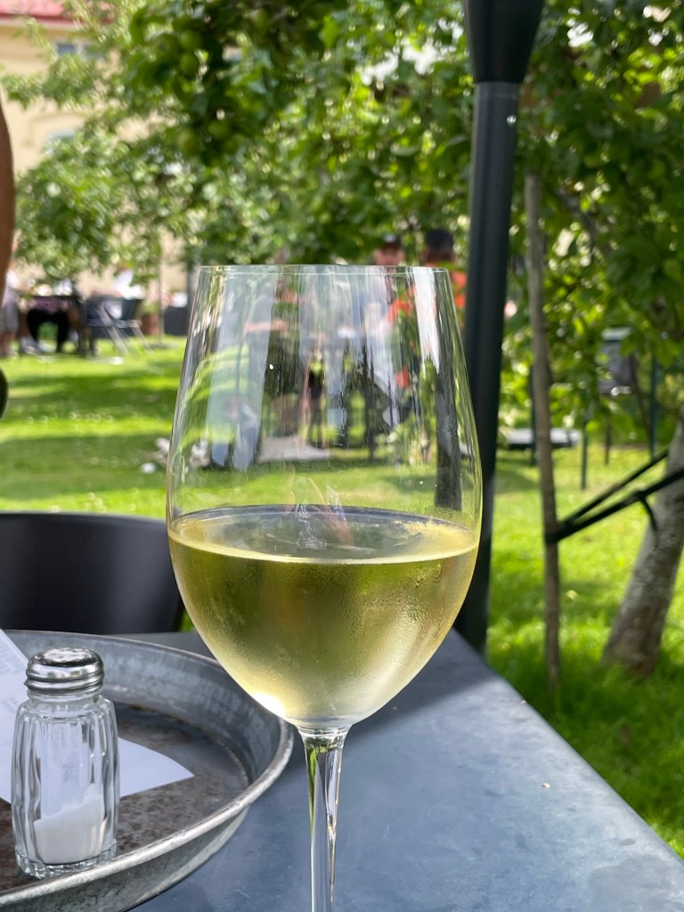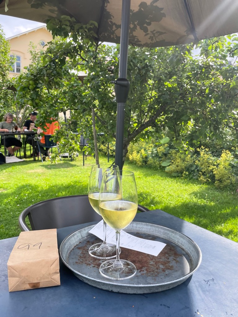 Vi beställer in mat och sätter oss i trädgården med ett glas vitt vin.