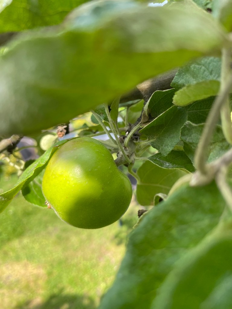 Miljön är välkomnande med äppelträd och mycket växter och blommor samt bord i trädgården.