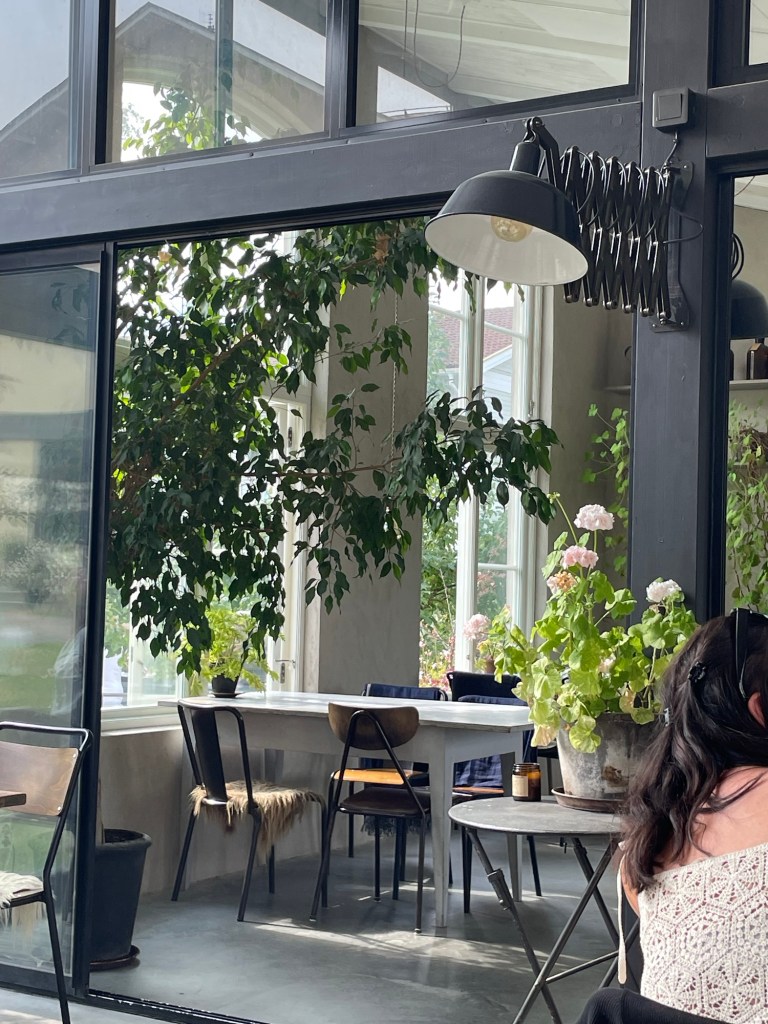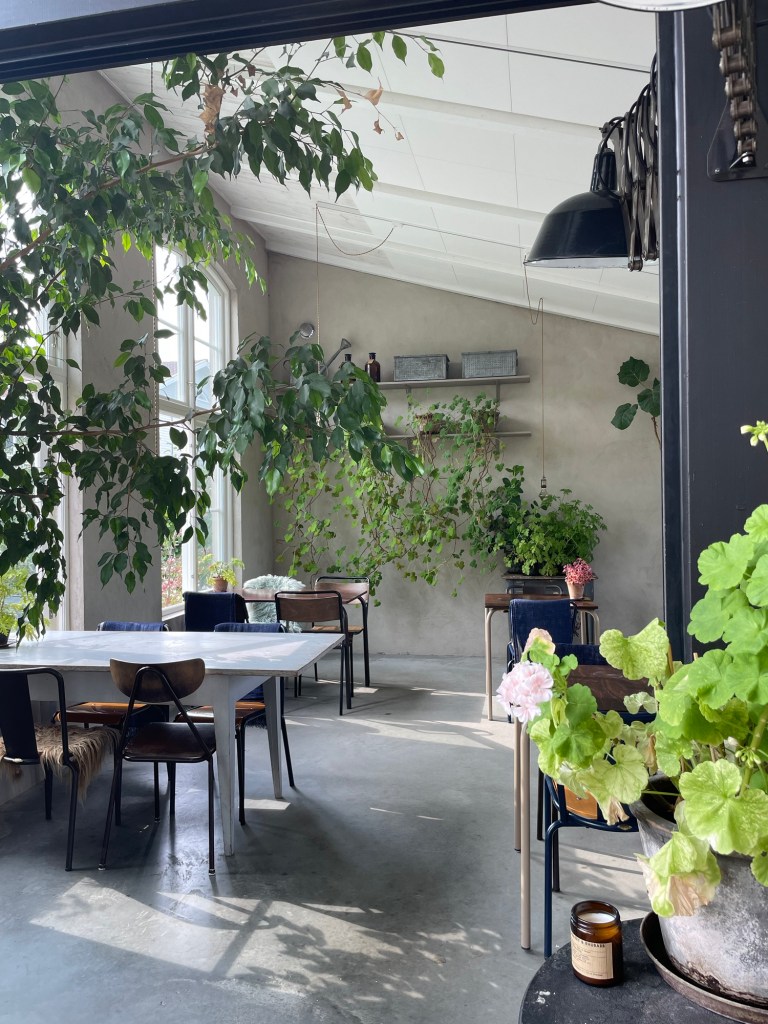 Sedan går vi in i orangeriet för att äta. Även här finns det mycket växter som gör miljön extra hemtrevlig.