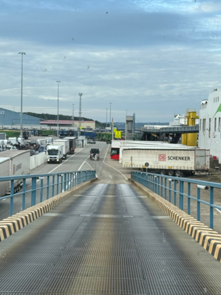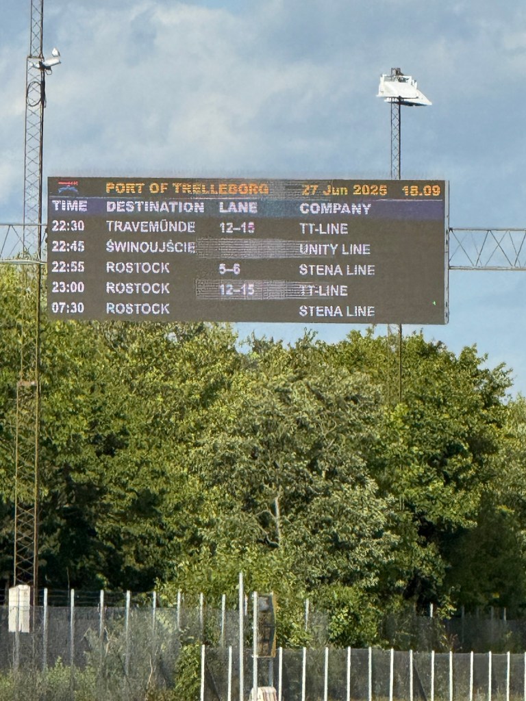 Vi hade bokat nattfärjan Trelleborg – Rostock för att sova på båten och komma till Tyskland hyfsat pigga. Färjan lämnade Trelleborg 22:55 och var i Rostock 06:10. Det var första gången Vi åkte från Trelleborg. Vi har tidigare valt att resa via Danmark för att slippa väntetider, men det var ganska skönt att komma till Tyskland pigg på morgonen. Prismässigt är det ungefär detsamma.