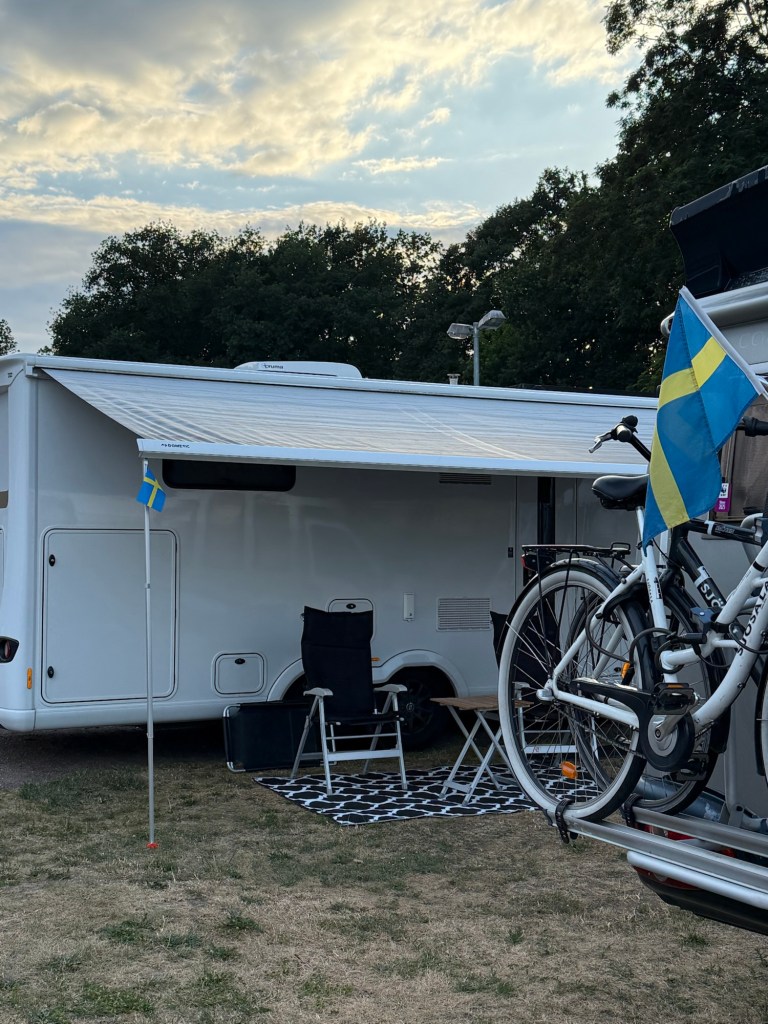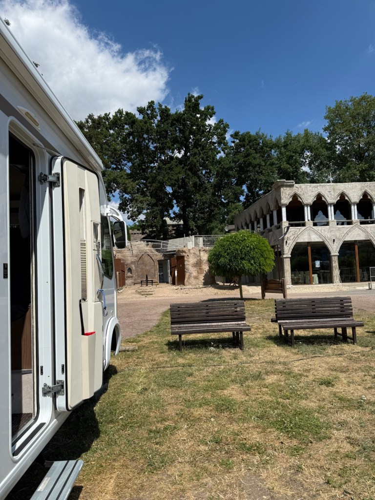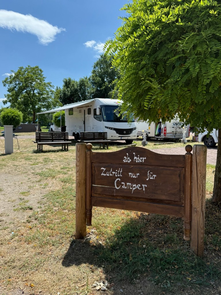 Här checkar man in och betalar i en automat. Vi betalar 12 € + 4€ per person, alltså totalt 20€. Vill man duscha eller använda el så betalar man för det i automater. Där gjorde Vi av med våra medhavda euroslantar och bör väl leta nya senare. Vi vill gärna ha tillgång till el och använda AC. När det är 30 grader, så kan Ni säkert tänka Er hur varmt det är i husbilen. (Vi använder AC för att kyla ner innan Vi lägger oss)