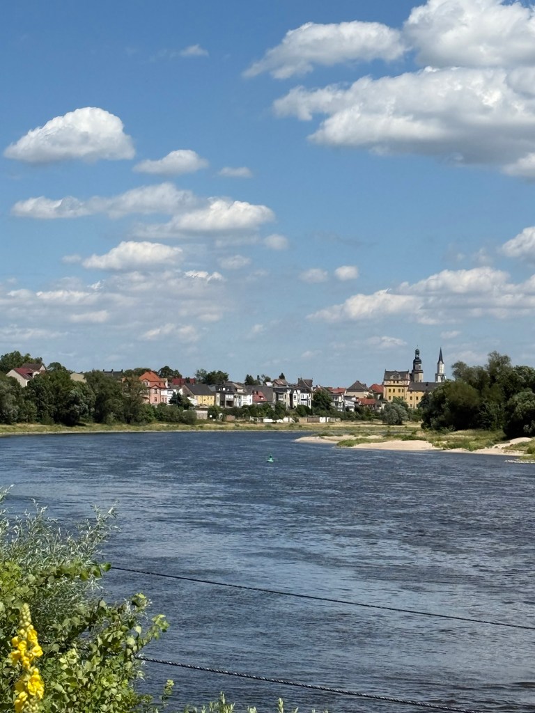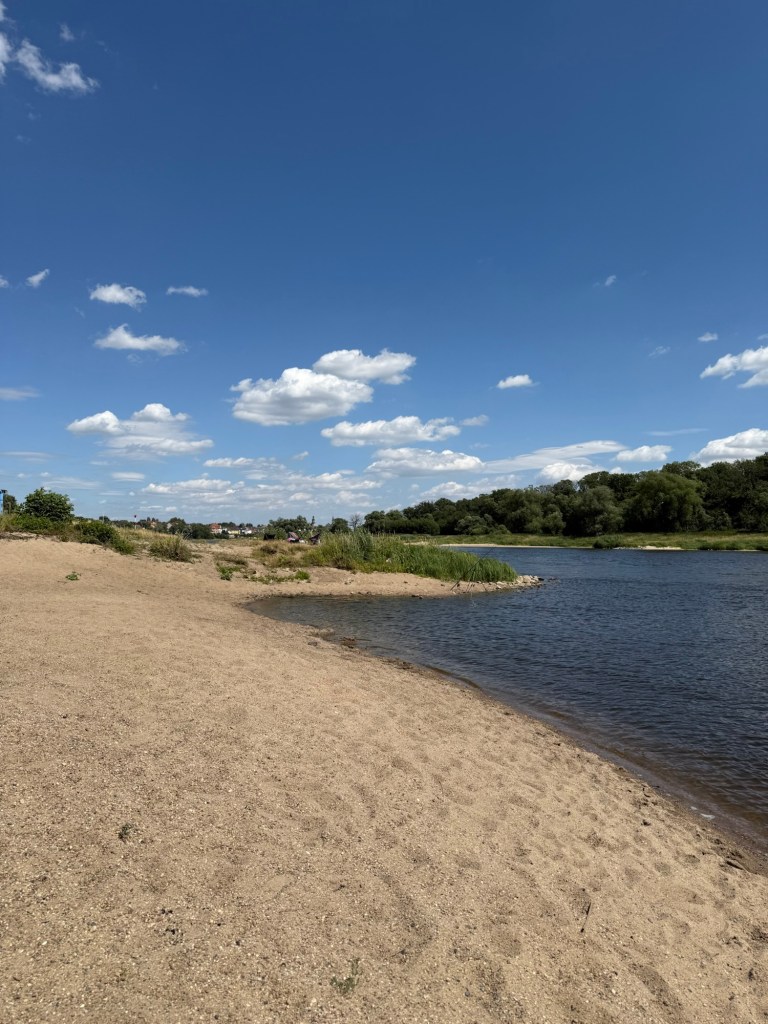 Eftersom Vi är på semester och det är sol och 30 grader kollar Vi in stranden. Det var inte många, nej faktiskt inte någon som var sugen att ta ett dopp i Floden Elbe. Eftersom jag hade bästa promenadskorna (flipflops) så gick jag ner och kände på vattnet. Det var varmt, men såg ut att vara gyttja och djupt, så fotbad fungerade bra.