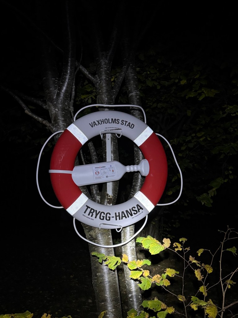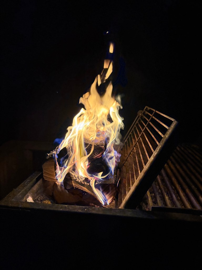 När mörkret har fallit tar Vi fram våra pannlampor och promenerar till en eldstad.