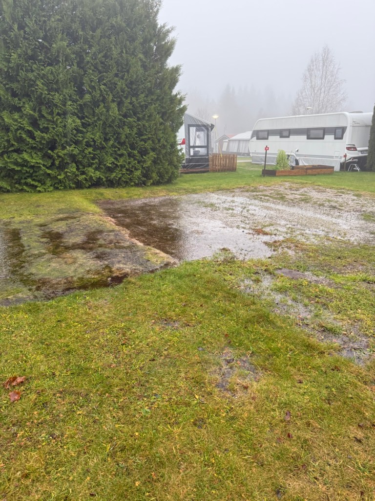 Vi bokar en plats som ser bra ut på kartan och efter dagens ösregn inser Vi att Vi inte vill ha pool på tomten. Här kan Vi inte köra upp.