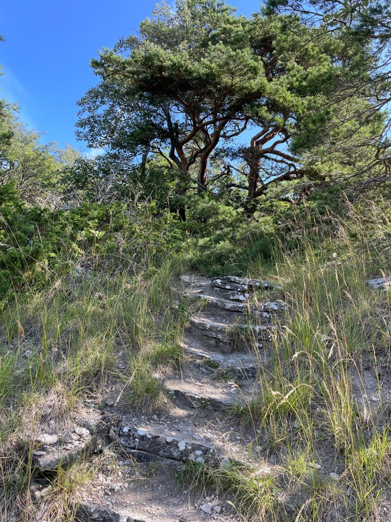 Vi svänger höger direkt efter färjan mot Engelska kyrkogården och Ryssnäs Naturreservat. Här finns tallskog, alvarmark, nakna klapperstensfält, agmyrar och tydligen torvmosse, men den missade vi. De två husbilarna bakom oss undrade nog var vi var på väg. Vägen är liten och smal, men klar värt en omväg.