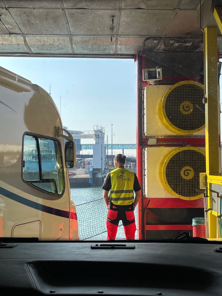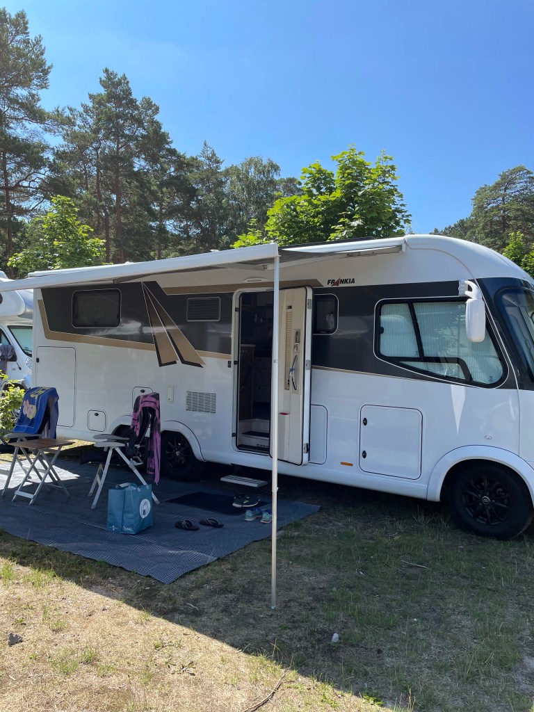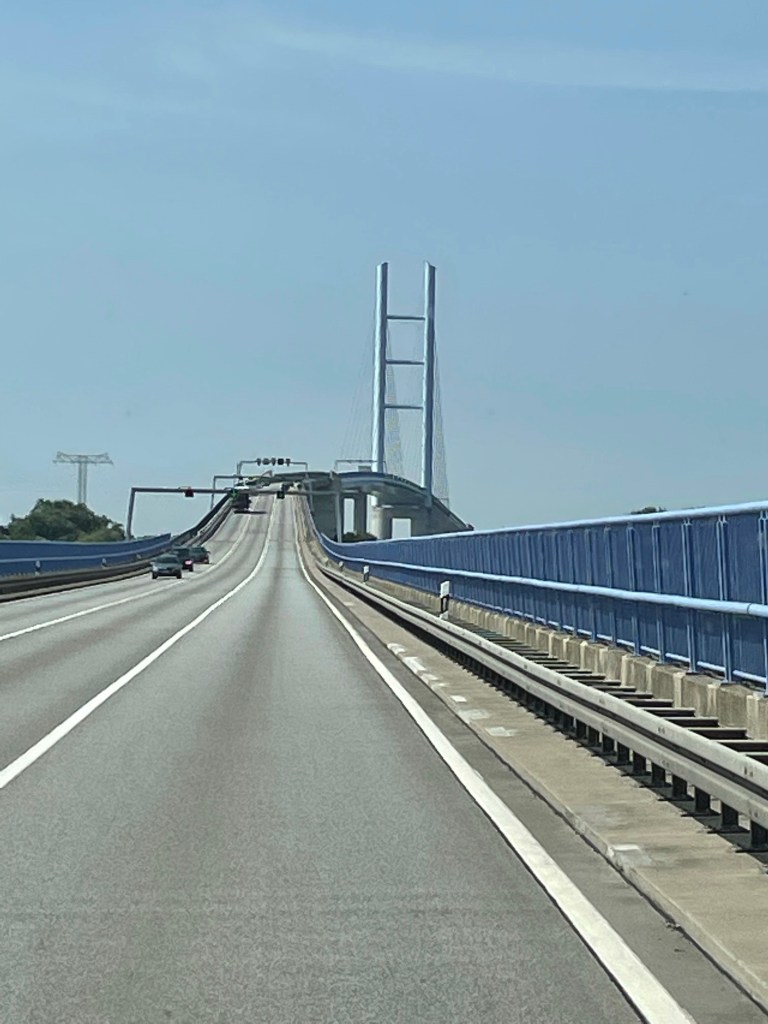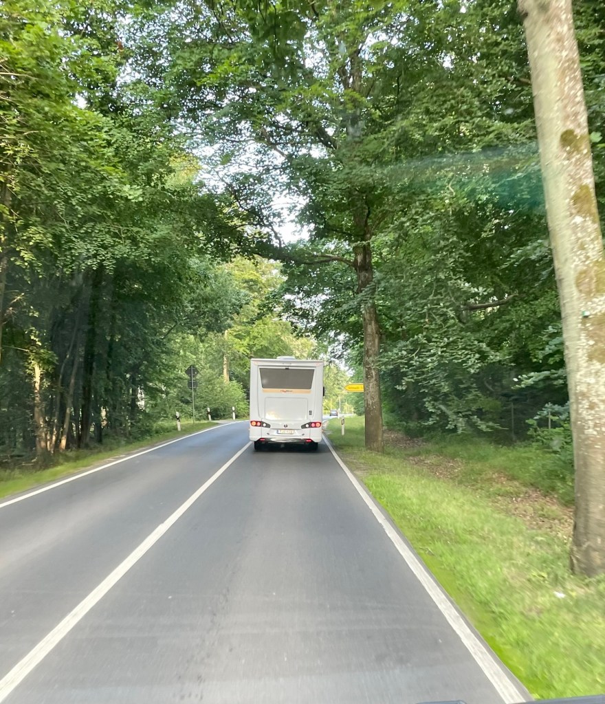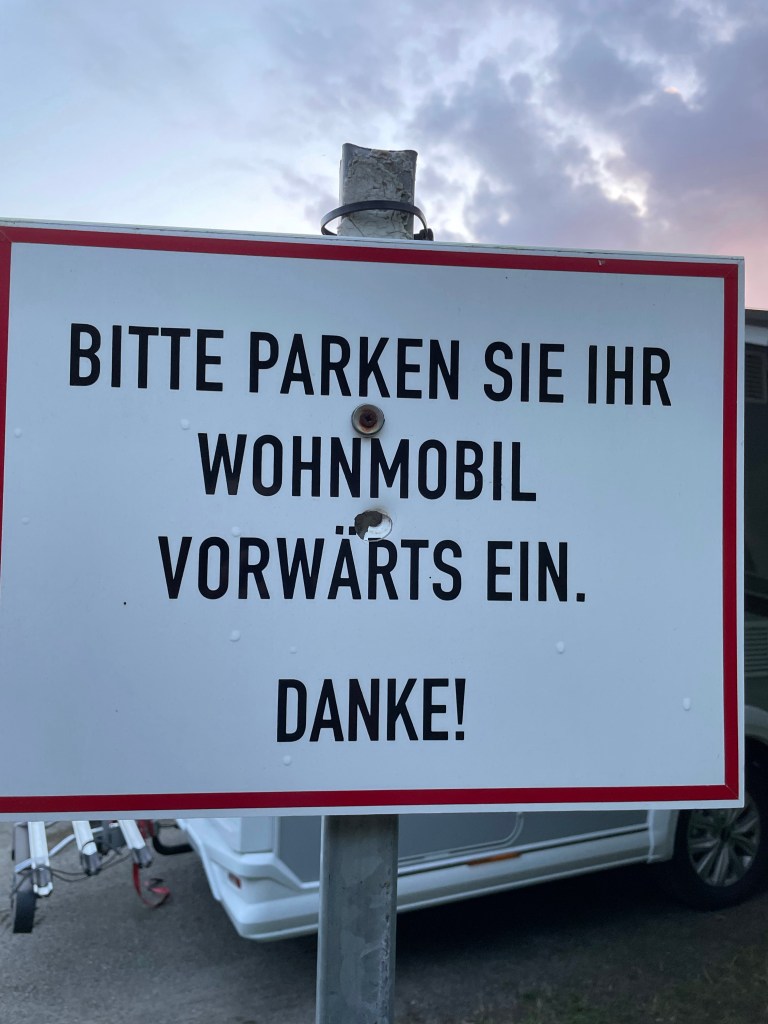 Efter stora vägen ser vi en skylt med en husbil på och svänger av. Tyskland är inte världsbäst på att sätta flera skyltar, så vi följer vägen genom ett villaområde där det pågår vägarbeten och vi undrar om vi verkligen kommit rätt för det finns ingen möjlighet att vända (eller möta någon heller) Mitt i ingenstans dyker det upp ett trafikljus… Vi skrattar och undrar om vi hamnat i dolda kameran. Vi kommer ner till Marinan och till vår glädje så finns det plats till oss.