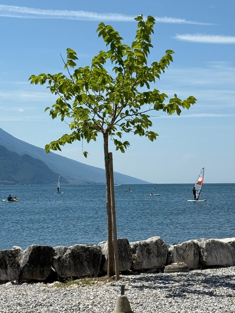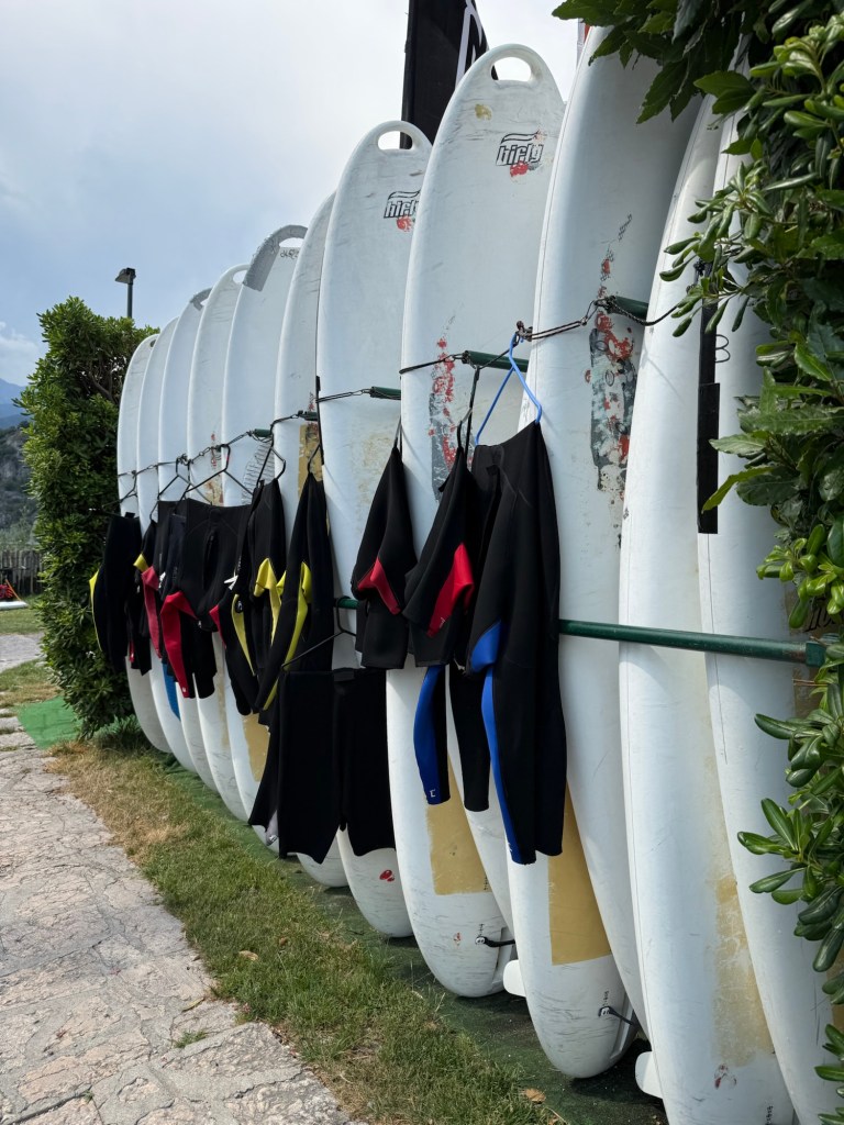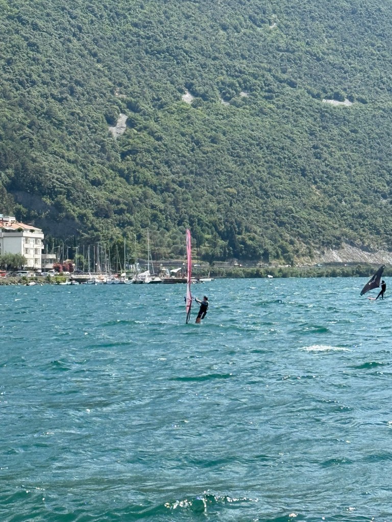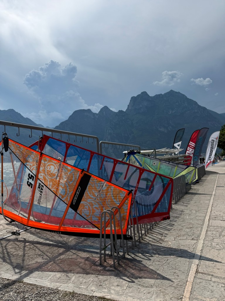 Torbole är vindsurfarnas paradis och det märks. Längs strandkanten ser Vi surfbrädor, segel och olika surfuthyrare och surfskolor. Man får även passa sig så man inte blir ikullsprungen av någon surfare som är på väg i eller upp ur vattnet bärandes på hela utrustningen.